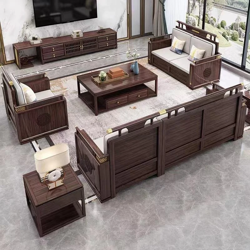新中式ウッディーウッドソファセット|中国風モダン・ラグジュアリー|冬夏兼用・広々としたリビングにぴったりの家具!