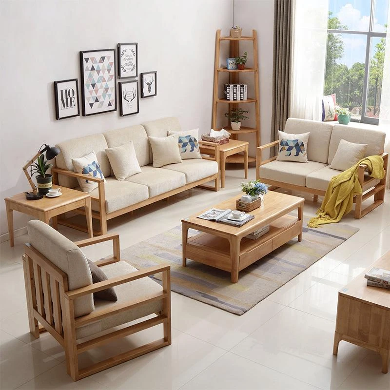 北欧風シンプルデザインの全木製ソファセット - 小型住宅に最適!高品質ファブリック使用のリビングルーム用ソファとコーヒーテーブルの組み合わせで、快適な空間を演出します。