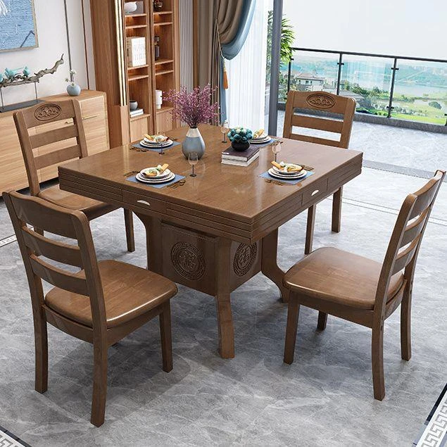 天然木製の伸縮式ダイニングテーブルセット - 正方形と円形の2WAY折りたたみ式、家族向けのコンパクトな八仙テーブル!小さなお部屋にもぴったり!