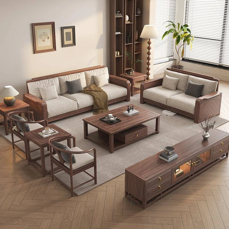新中式ブラックウォールナット無垢材ソファセット - モダンでシンプルなデザイン、広々としたリビングにぴったり!高収納機能付きで、家族やゲストとの快適な時間を実現します。