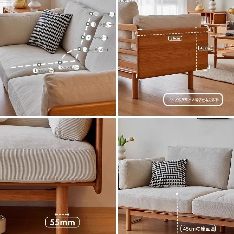 北欧スタイルのチェリーウッド製、モダンでシンプルな南山ソファ。小さなリビングにぴったりな3人掛け布製ソファと1人掛けの無垢材ソファを組み合わせて、快適な空間を演出します。