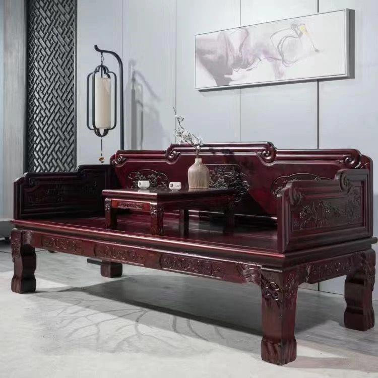 新中式スタイルの本格木製ロハンベッド3点セット - 金華梨の美しい客間家具、アンティーク風ソファベッド、禅の心を感じる貴妃榻。あなたの生活空間に優雅さと静けさをもたらします!