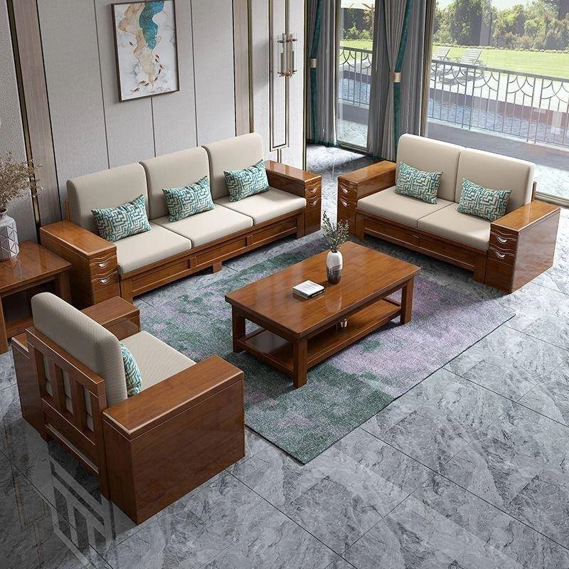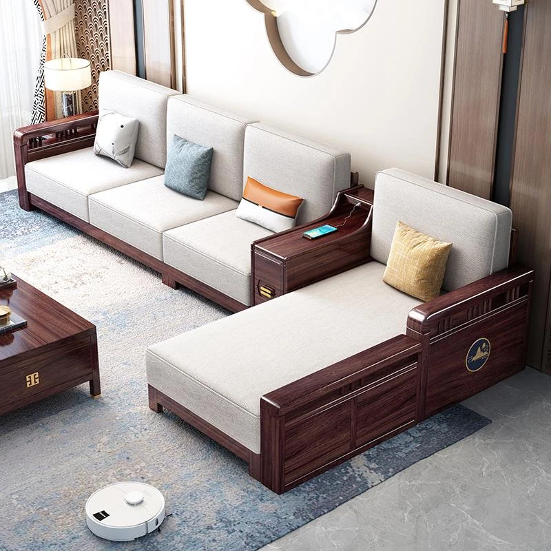 新中式デザインのウッド調ウ金木製ソファセット、大小両方の部屋にぴったり!収納付きのエレガントな布製カウチソファで、贅沢なリビング空間を演出します。家庭に最適なスタイルで、快適さと美しさを兼ね備えています。
