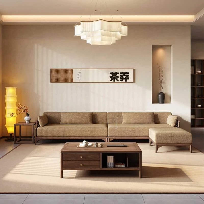 新中式 北米産ブラックウォールナット 布製 コーナーソファ 禅の雰囲気を感じる L字型 チェア付き 中小型オフィスにも最適なソファ