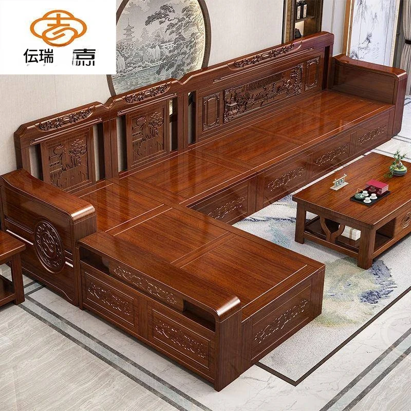 樟木の無垢材ソファセット | 全面無垢材の中収納式家具 | リビングにぴったりのコーナー彫刻デザイン | YM-809 花香物典古木の魅力を感じてください!