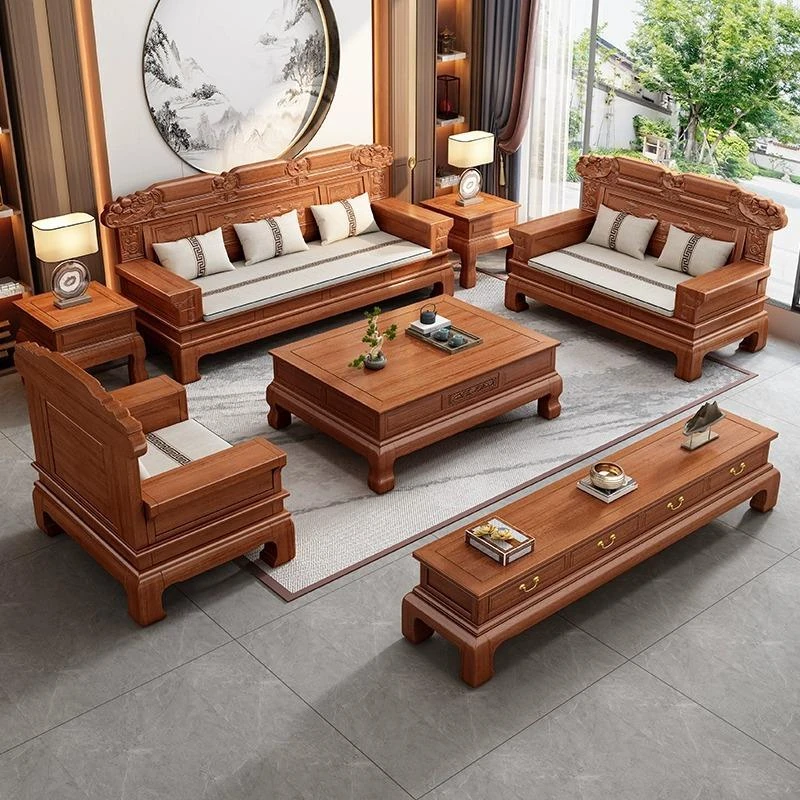 HF2X高級紅木家具セット|鶏翅木使用の中華スタイル11点セット|明清時代の精緻な彫刻|全て無垢材の豪華ソファでおしゃれな別荘空間を演出!