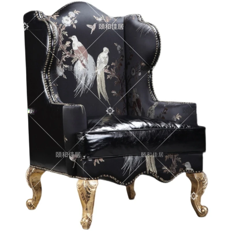 アメリカンカントリー風 本革シングルソファ 欧州スタイルの木製彫刻トラチェア ヴィラ向け ブラックフラワー&バード刺繍ソファで、豪華なリラックスタイムをお楽しみください!