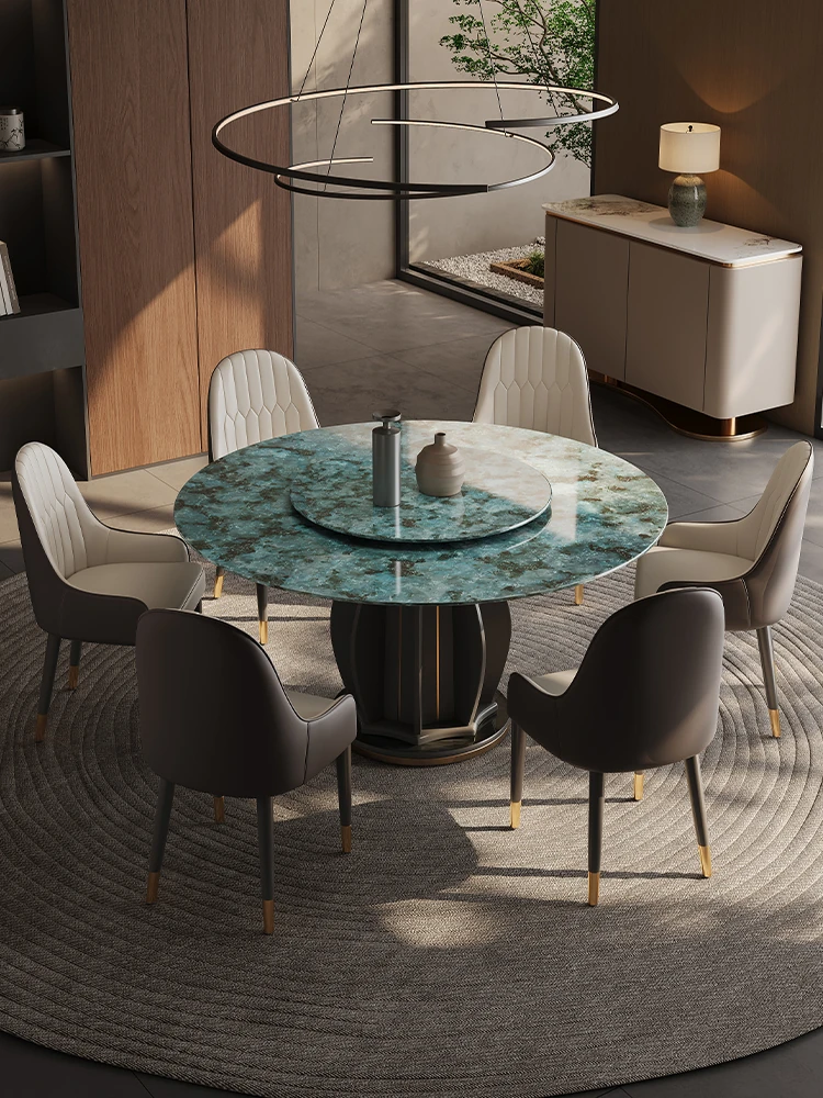 高級感溢れる天然超晶石製のラウンドダイニングテーブル - 回転式デザインで使い勝手抜群!イタリアンスタイルの洗練された微晶石テーブルは、家族や友人との食事に最適な小型住宅向けです。