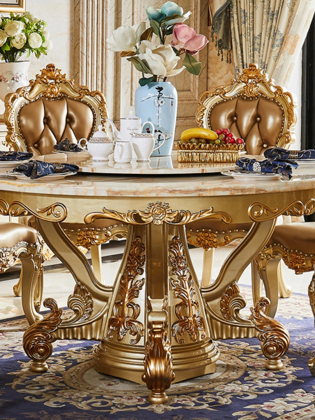 欧風大理石ダイニングテーブルセット 電動回転式付き 高級感溢れる別荘向け 全実木製 大型丸テーブル 家庭用 完璧な食事体験を提供!