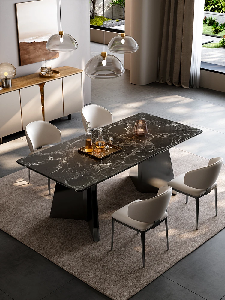 2025年デザイン版 プラチナダイヤモンド天然ラグジュアリーストーン長方形ダイニングテーブル カーボンファイバー&無垢材脚付き 高級ダイニングチェアセット 絶妙な美しさと耐久性を兼ね備えた一品!