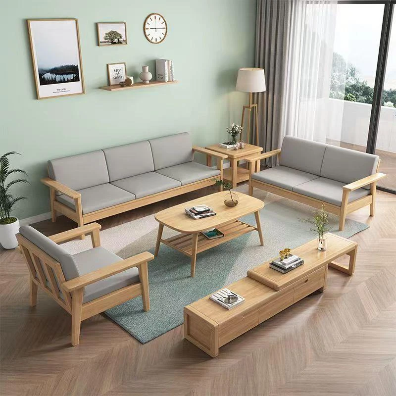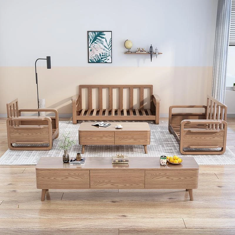 Nordic Minimalist Solid Wood Sofa Set for Small Spaces - Complete All-Wood Fabric Sofa and Coffee Table for Your Living Room
