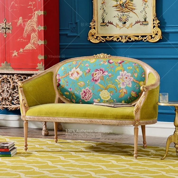 Direct Sales French Neoclassical Solid Wood Fabric Printed Double Sofa Chair - American Style Carved Sofa for Photography Studio Sample Room