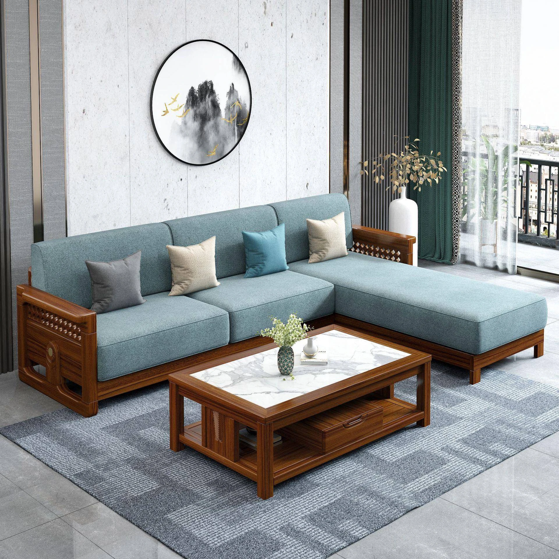 Modern Chinese Style Solid Wood Sofa Set with Wenge Wood Chaise Lounge and Corner Coffee Table - Complete Living Room Furniture for Small Spaces