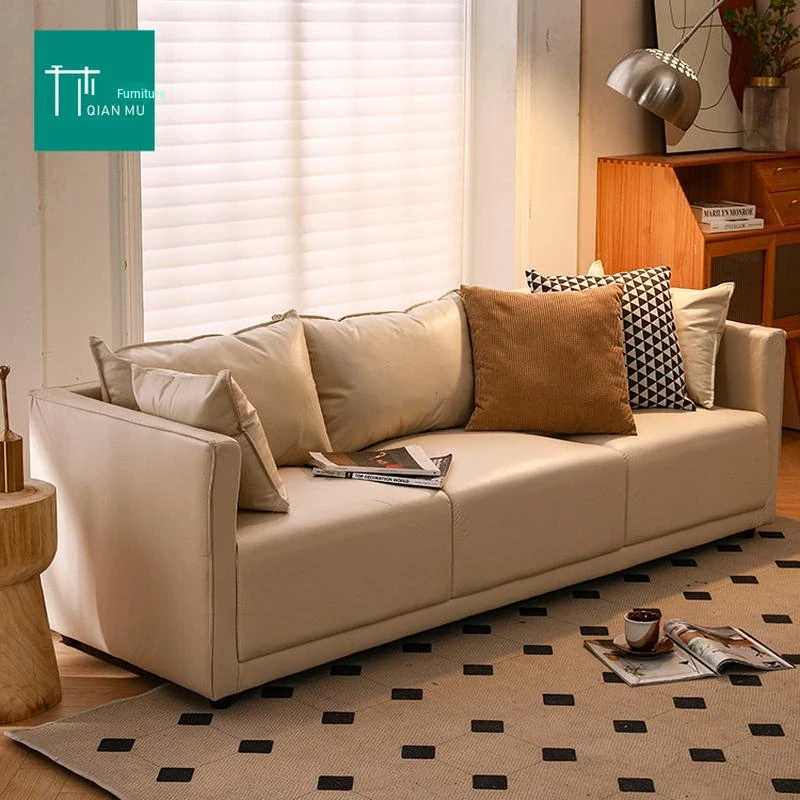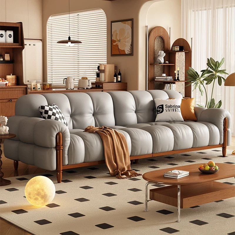 Retro Piano Key Fabric Sofa - New Cream Style for Small Living Rooms, Real Leather Combination with Natural Wood Accents. Perfect for Modern Spaces!