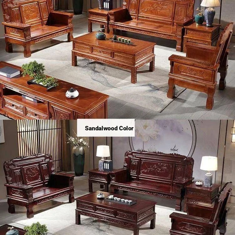 Solid Wood Sofa Set - Classic Chinese Style with Antique Carvings, Versatile for Winter and Summer, Affordable Rustic Design for Cozy Living Rooms