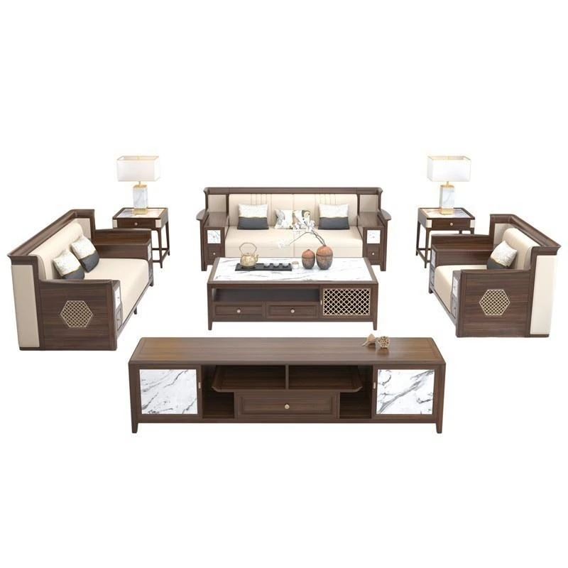 Elegant Solid Wood Sofa Set in New Chinese Style - Modern Minimalist Luxury Leather Furniture for Villa Living Room