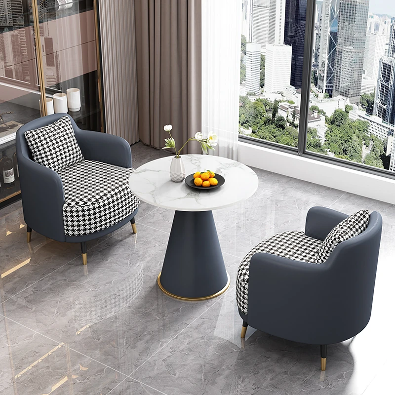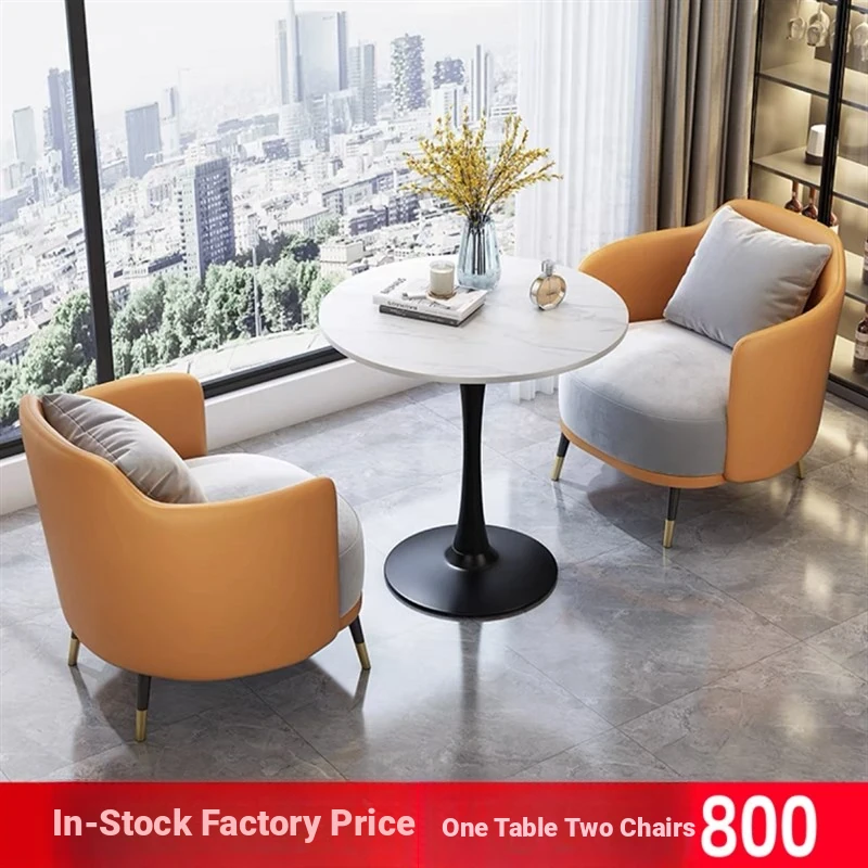 Stylish Reception Desk and Chair Set for Real Estate Sales Office – Trendy Lounge Sofa and Coffee Table Combo with Small Round Table and Two Chairs for Conversations and Negotiations. Perfect for Creating an Inviting Atmosphere!