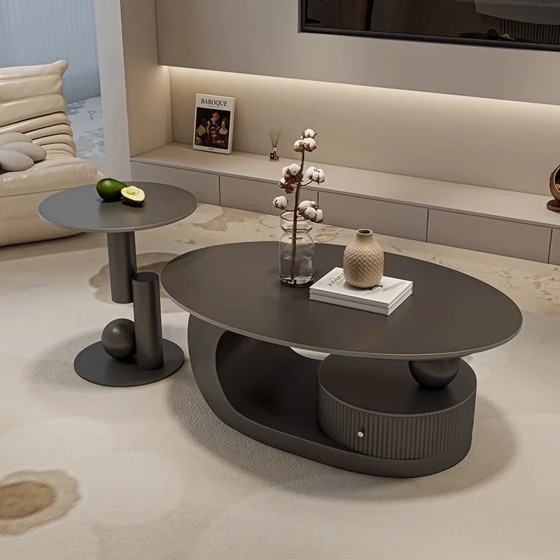 Elegant Oval Coffee Table with Stone Surface - Modern Minimalist Design for Small Living Spaces, Perfect for Luxurious Home Decor