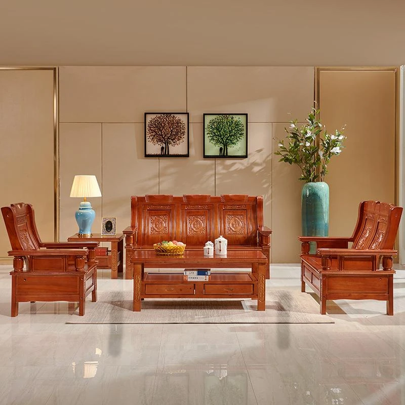 All-Solid Wood Sofa Set for Small Spaces - Versatile for Winter and Summer, New Chinese Style Vintage Sofa for Living Room, Office, and Affordable Rural Homes.