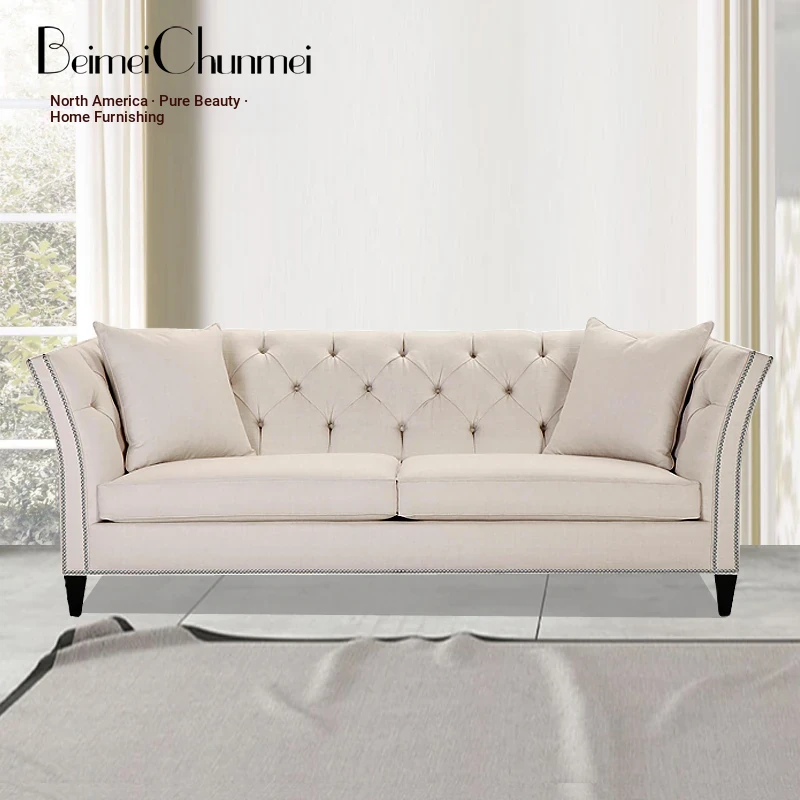 Stylish American Modern Casual Solid Wood and Fabric Leather Upholstered High-End Minimalist Shelton Three-Seat Sofa for Living Room