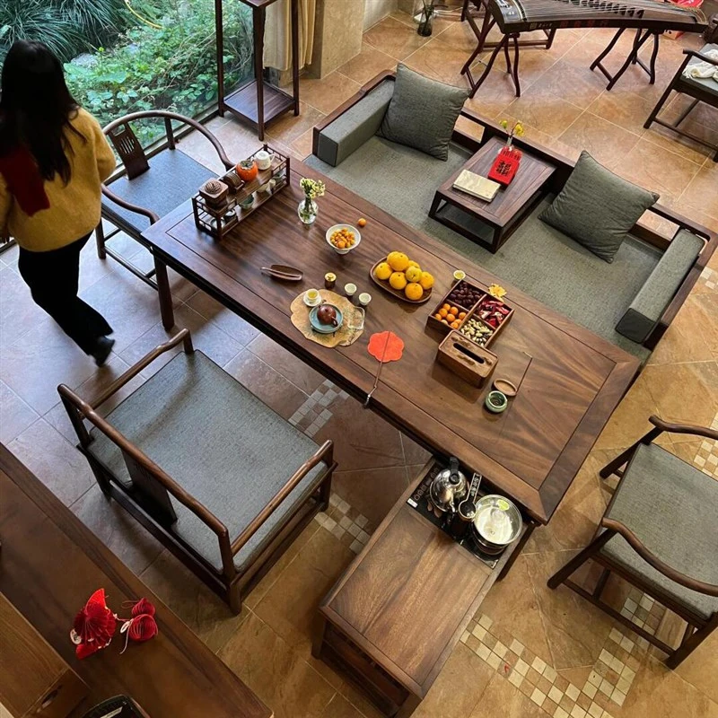 Modern Solid Wood Black Walnut Sofa Set - Versatile Storage with Winter/Summer Design, Complete Living Room Solution with L-Shaped Chaise Lounge and Scenic Aesthetics.
