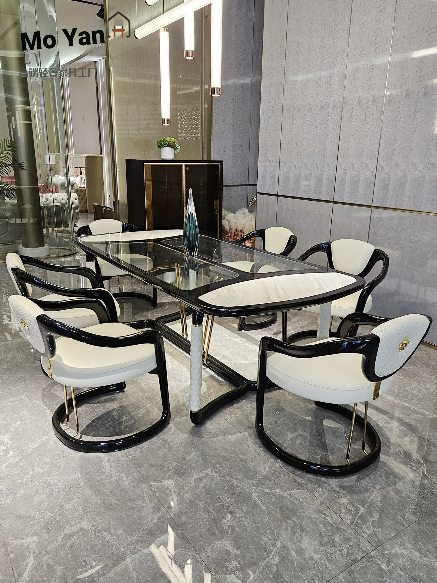 Luxury Black Rose Natural Stone Dining Table - Rectangular Stainless Steel and Solid Wood Combination Set with Creative Chairs