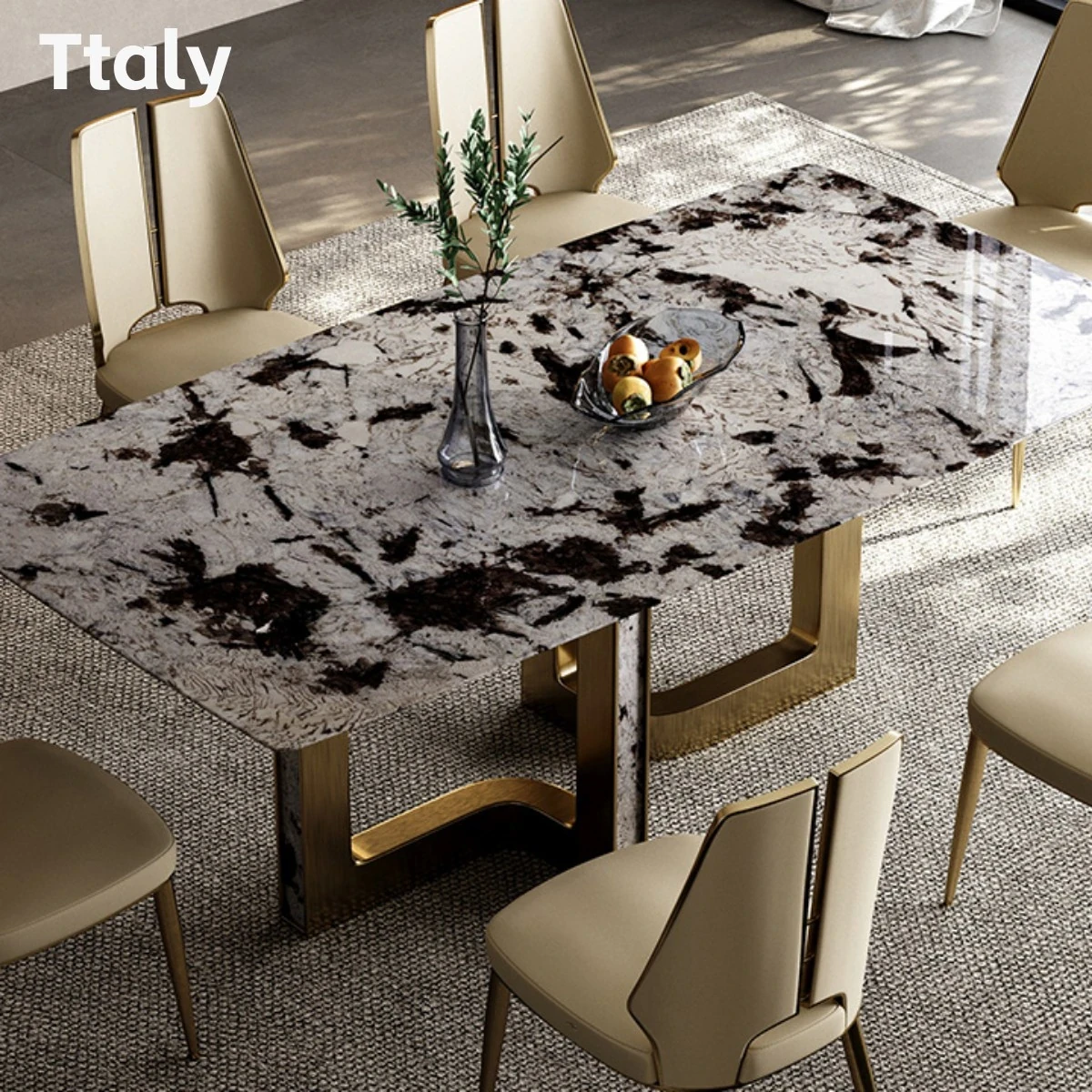 Luxurious Platinum Diamond Natural Stone Dining Table - Elegant Italian Style Rectangular Marble Table with Chairs, Perfect for Upscale Dining Experiences.