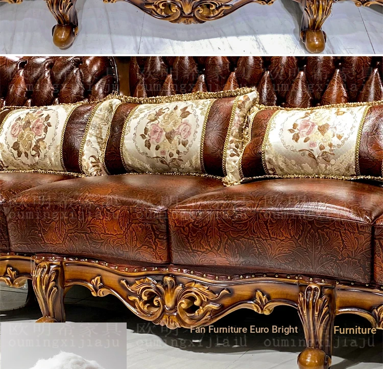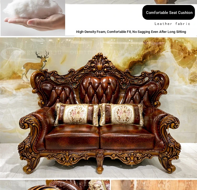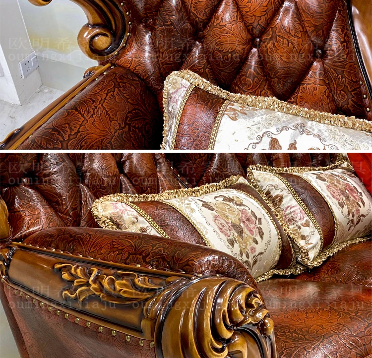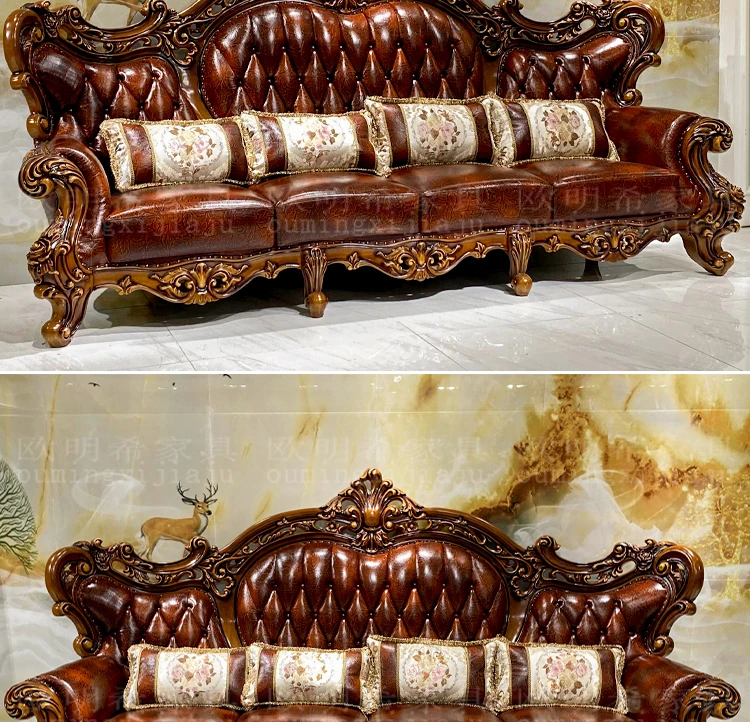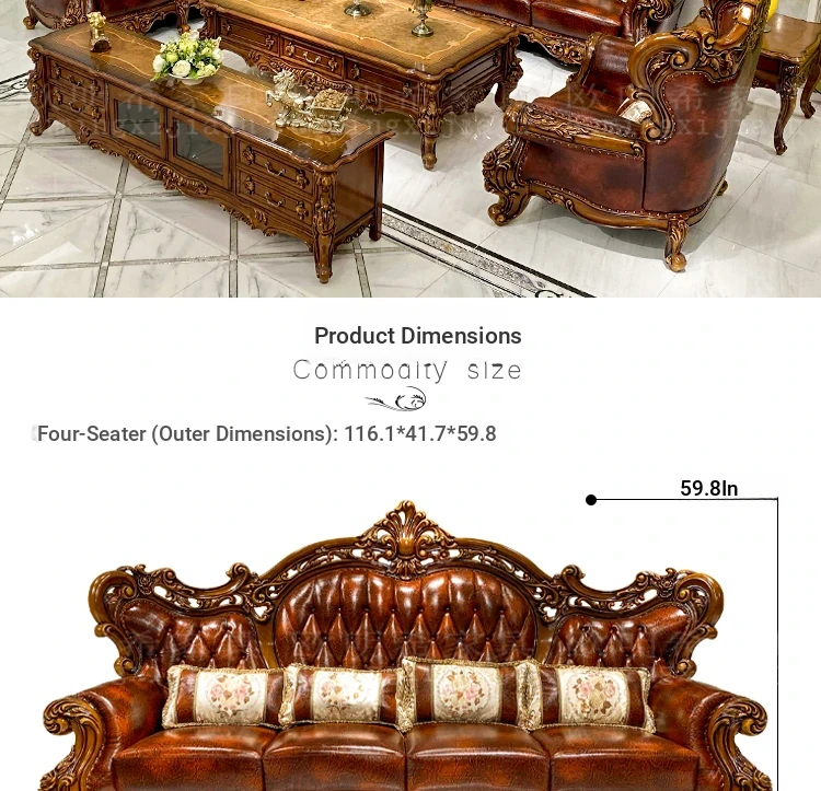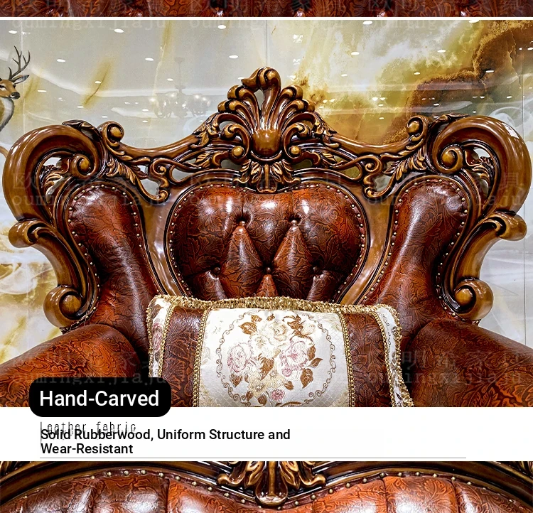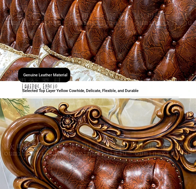 Elegant European-Style Genuine Leather Sofa Set - Classic American Design for Luxurious Villas and Spacious Living Rooms, Crafted with Top-Grade Cowhide and Solid Wood Furniture