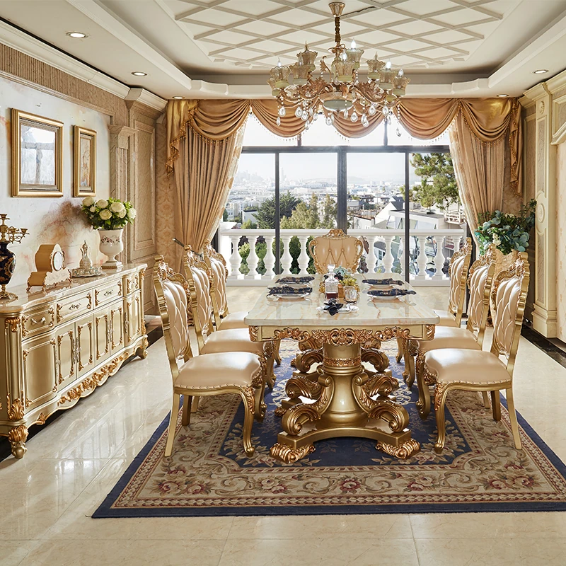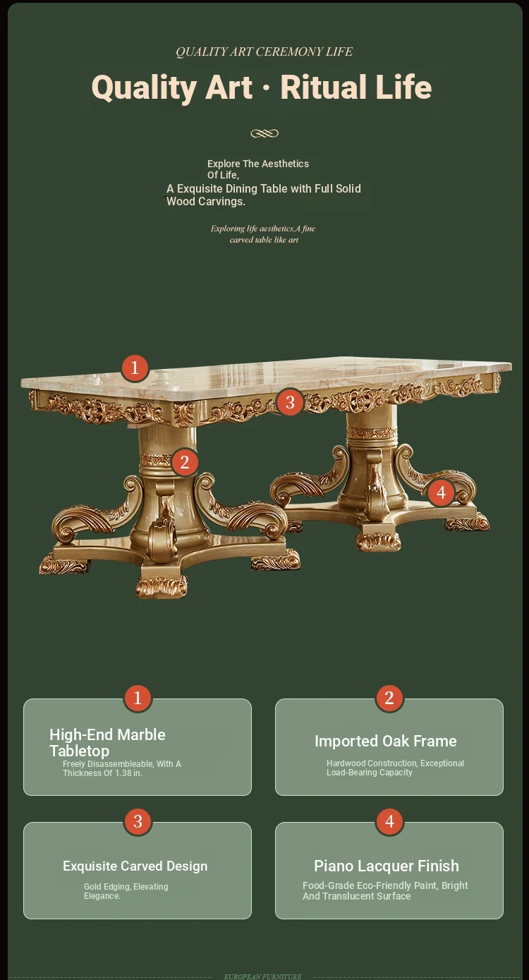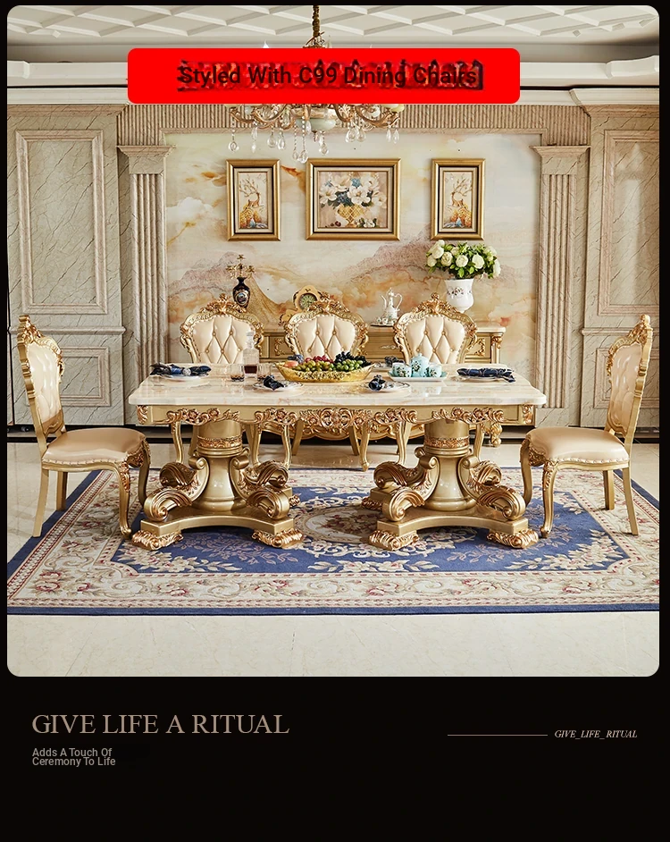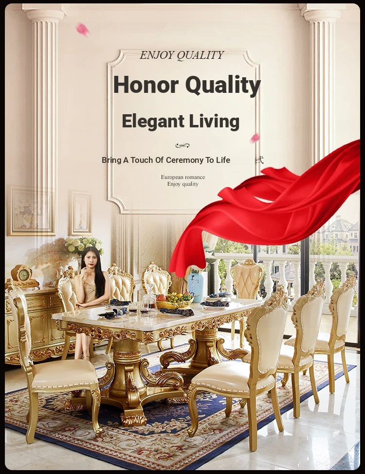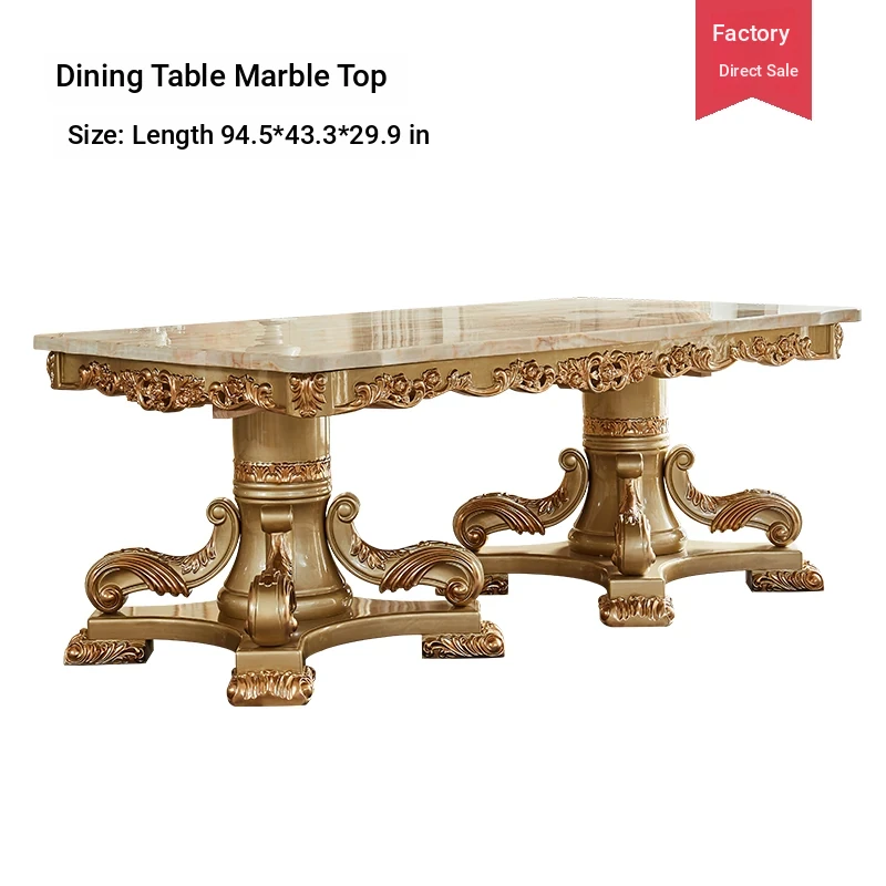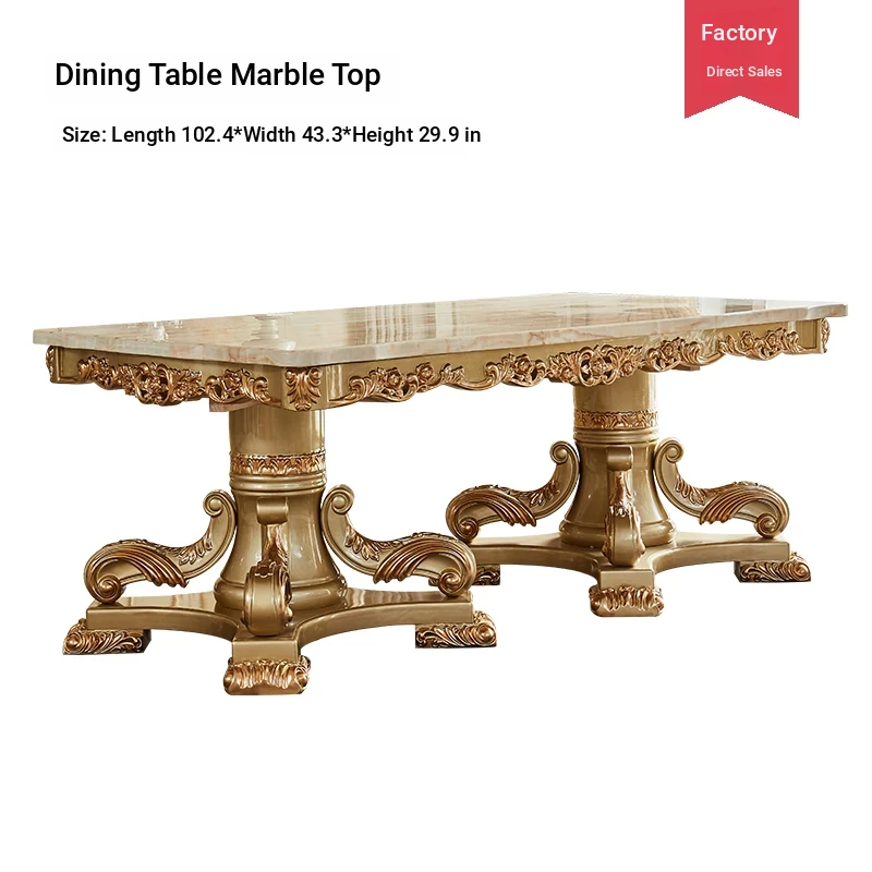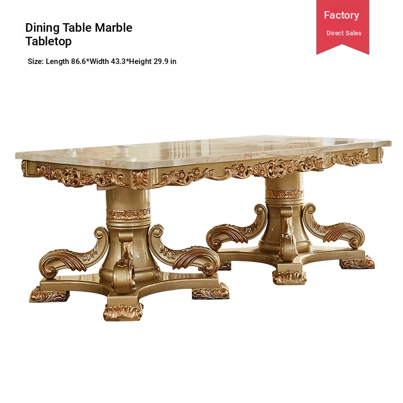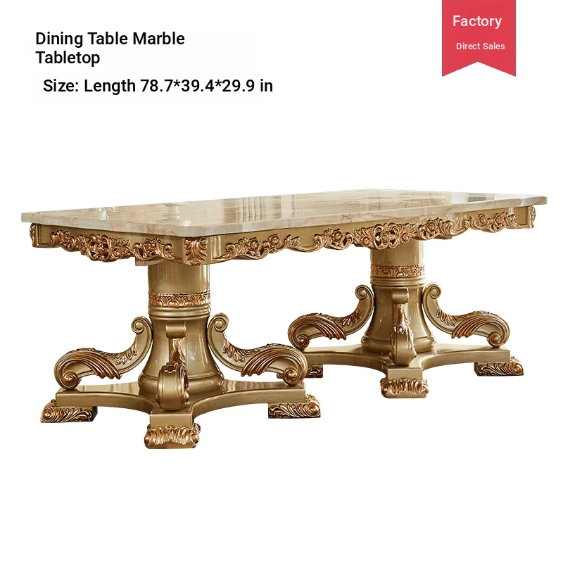 Elegant European-Style Solid Wood Carved Marble Dining Table and Chair Set - Luxurious Rectangular Table for 10 People, Perfect for Villas and Grand Dining Experiences!