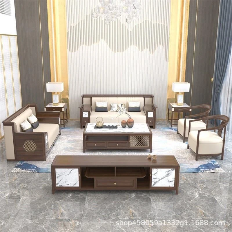 Elegant Solid Wood Sofa Set in New Chinese Style - Modern Minimalist Luxury Leather Furniture for Villa Living Room