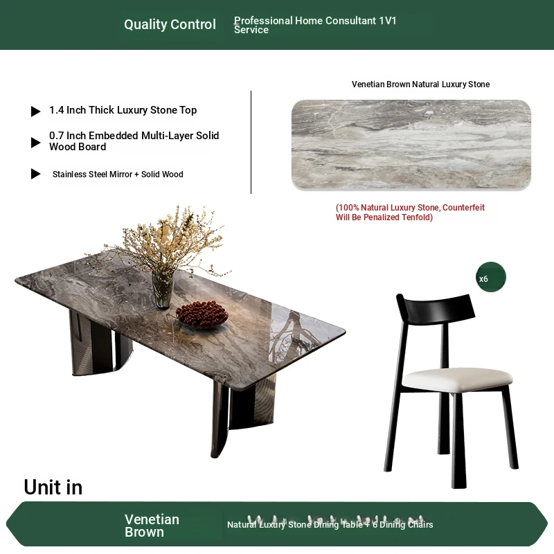 [Venice Brown Made in China] Natural Luxury Stone Dining Table + Dining Chair * 6 (Pure Natural Luxury Stone, Ten Penalties for Fake)