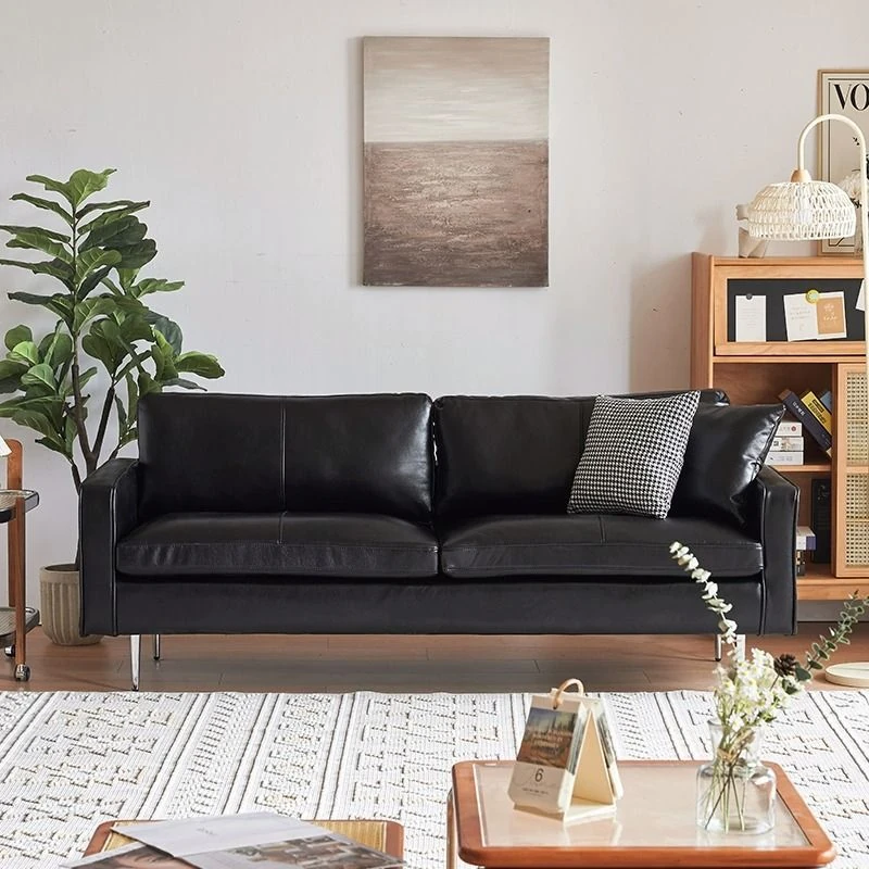 Modern Retro Minimalist Black Leather Sofa for Small Living Room – Stylish 3-Seater for Business and Home Use, Perfect for Compact Spaces