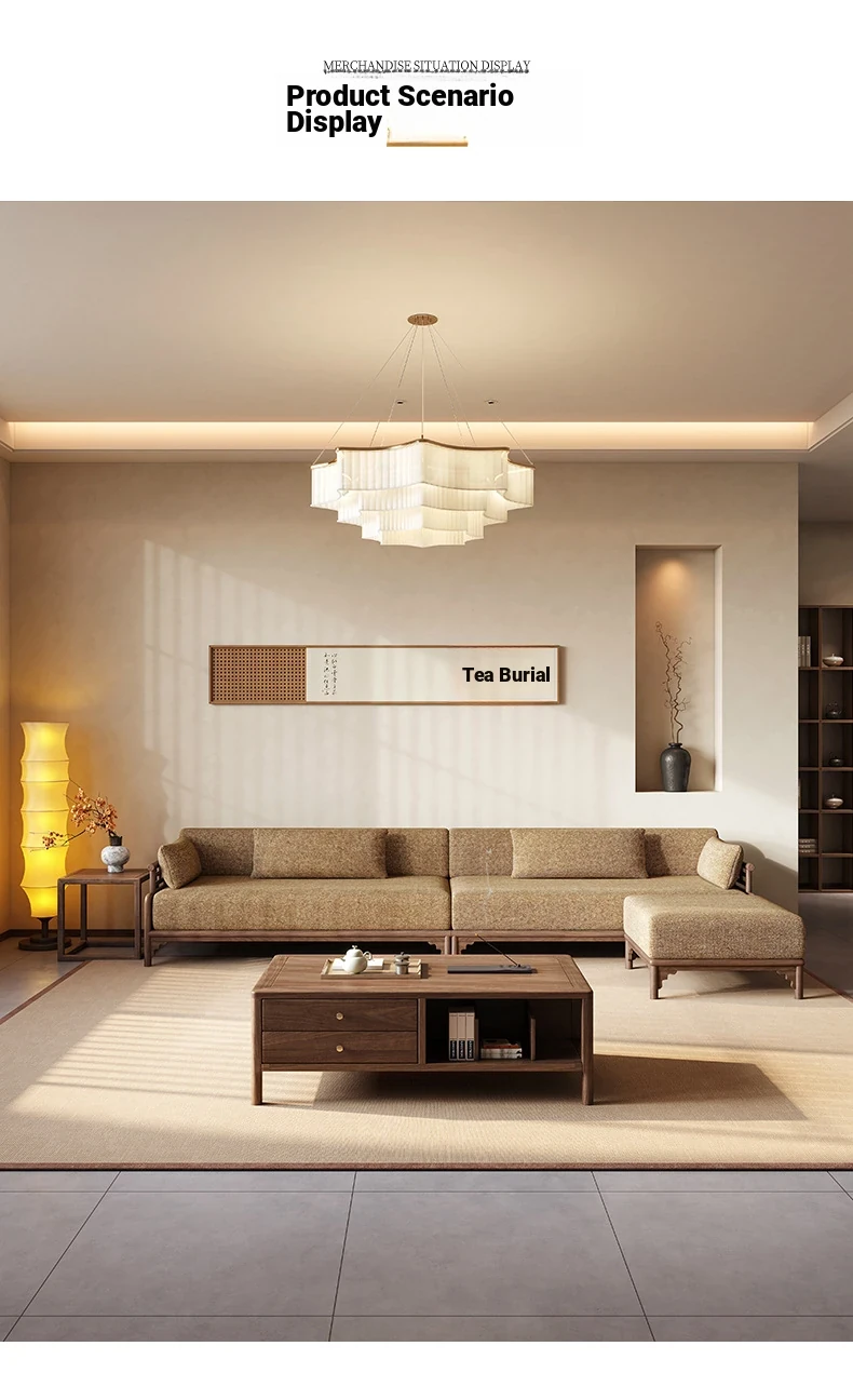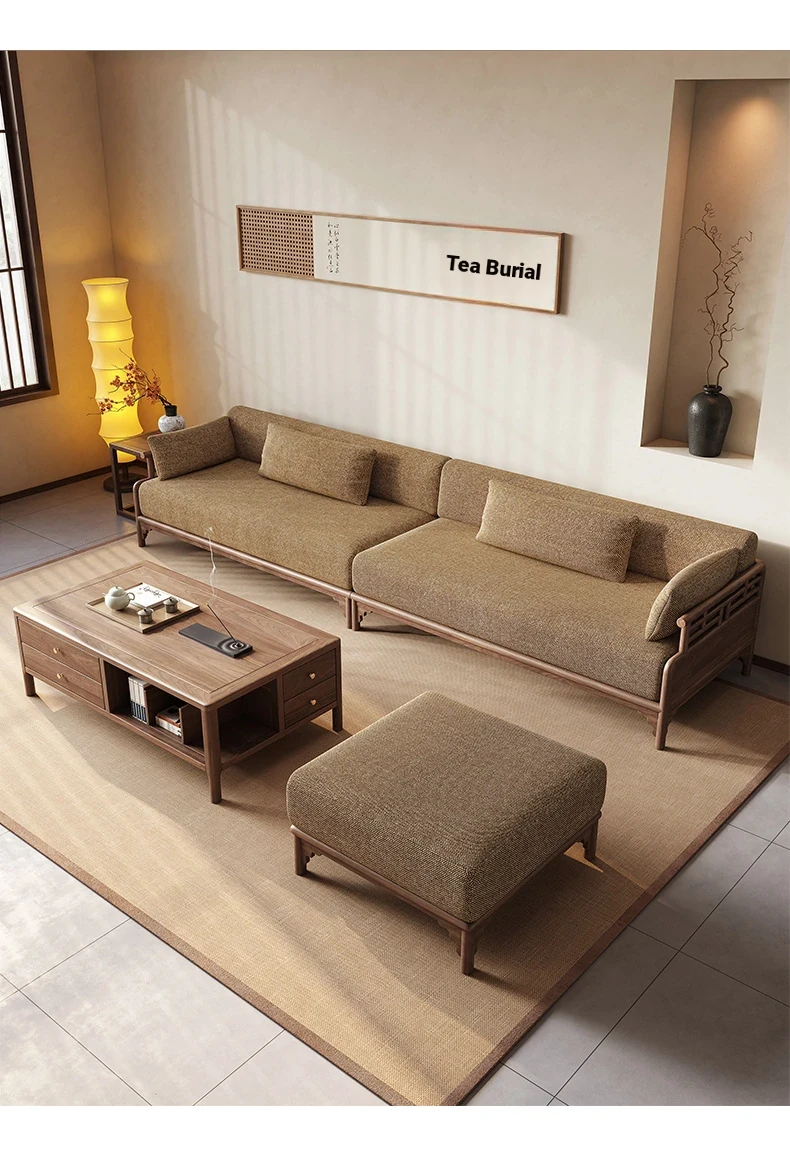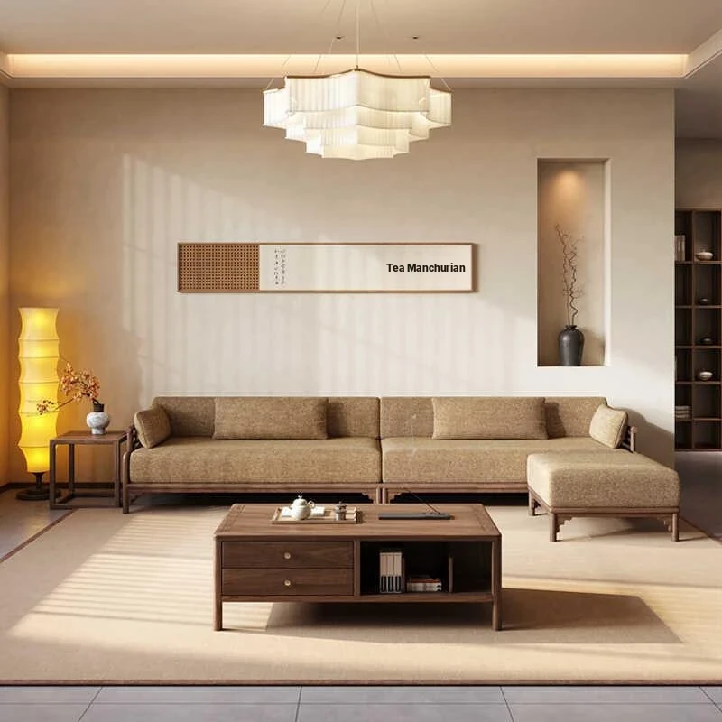 New Chinese Style North American Black Walnut Upholstered Corner Sofa - Zen-Inspired L-Shaped Chaise Lounge for Small to Medium Spaces and Office Use