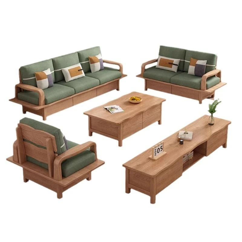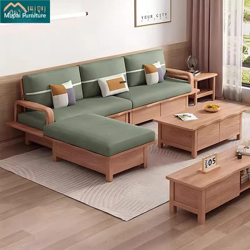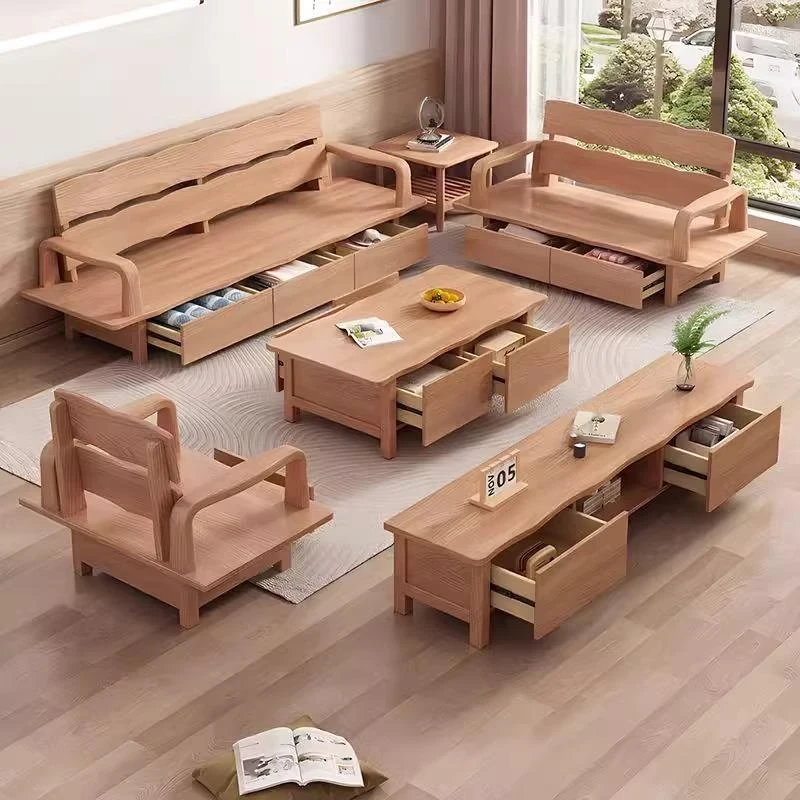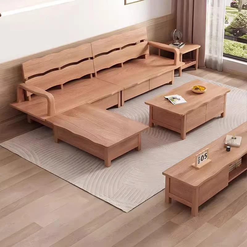 Nordic Solid Wood Sofa with White Wax Wood Storage - Large Corner Design with Drawers, Perfect for Winter and Summer in Spacious Living Rooms - Natural Wood Finish
