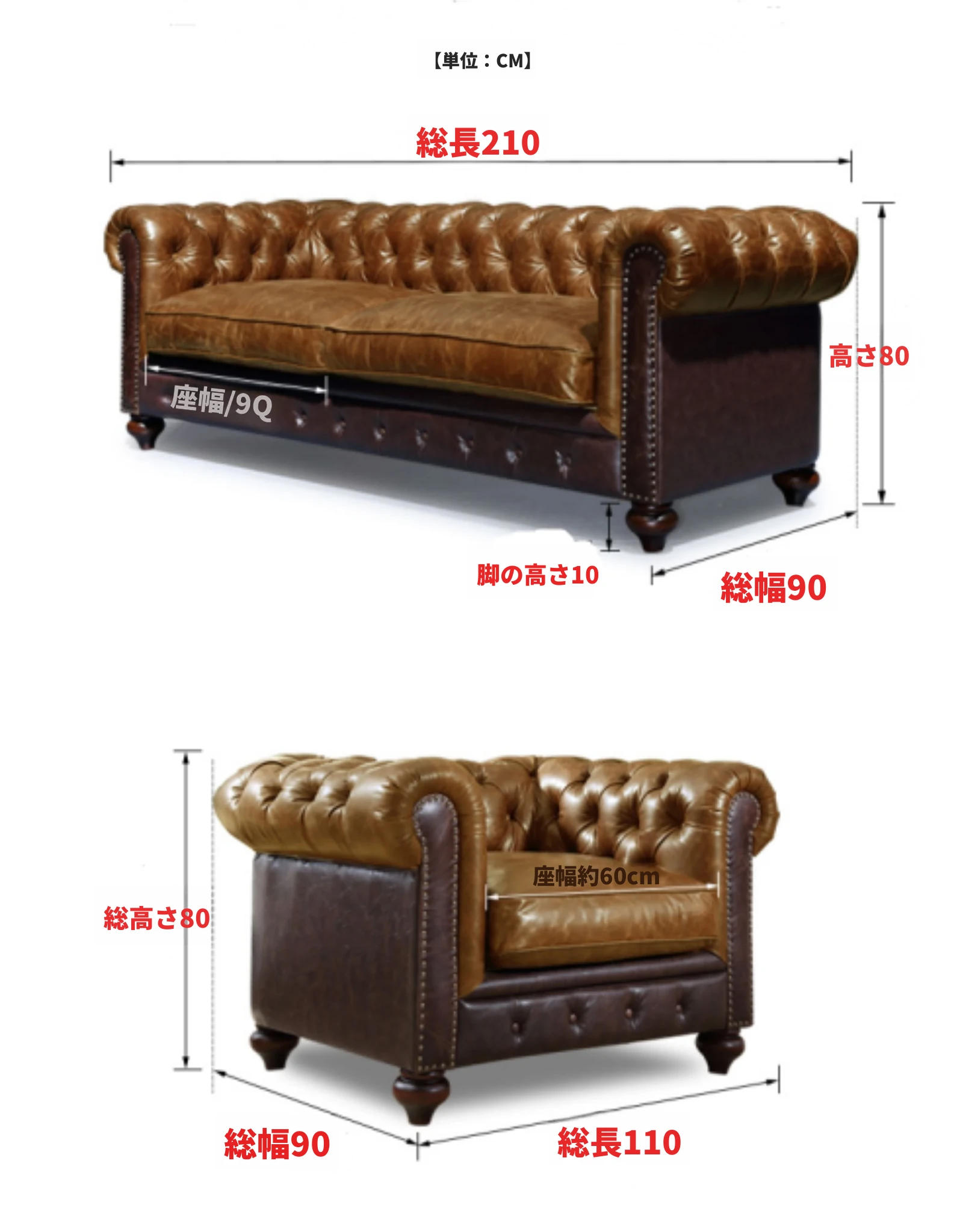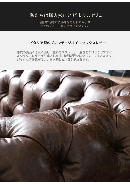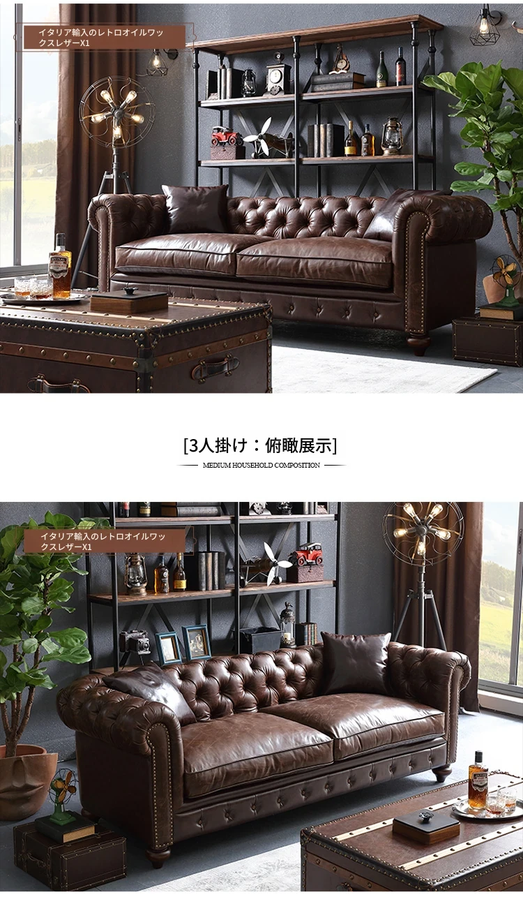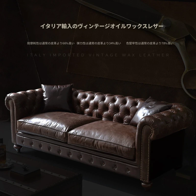 アメリカンレトロスタイルのレザーソファ - 本革ブラウンオイルワックス仕上げ!ワインセラーやホテルのロビー、小型リビングにぴったりな高級感あふれるデザイン。快適さと洗練を兼ね備えた一品で、あなたの空間を特別に演出します。