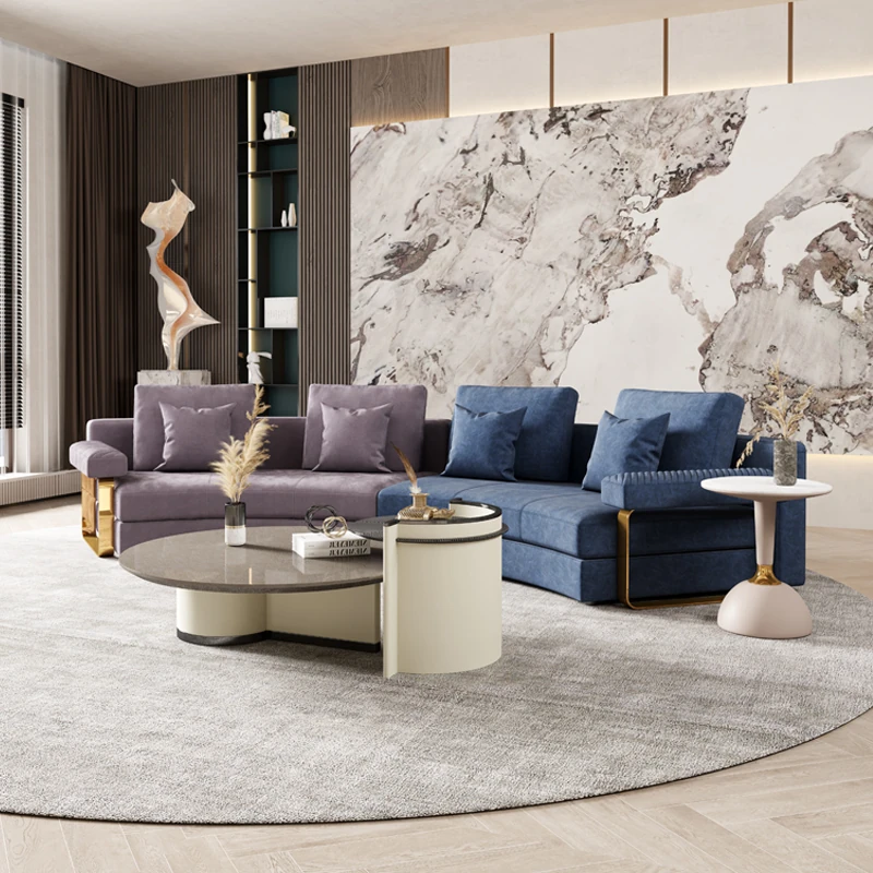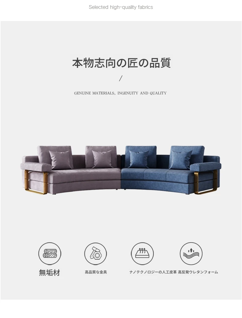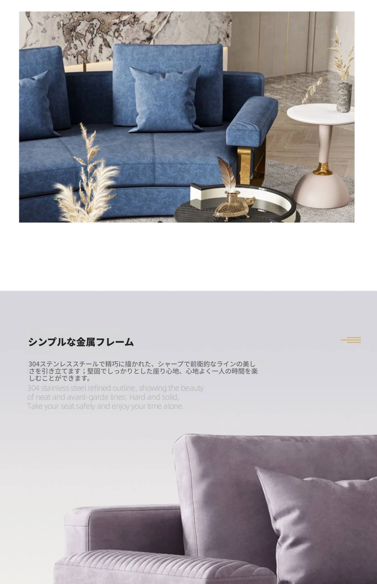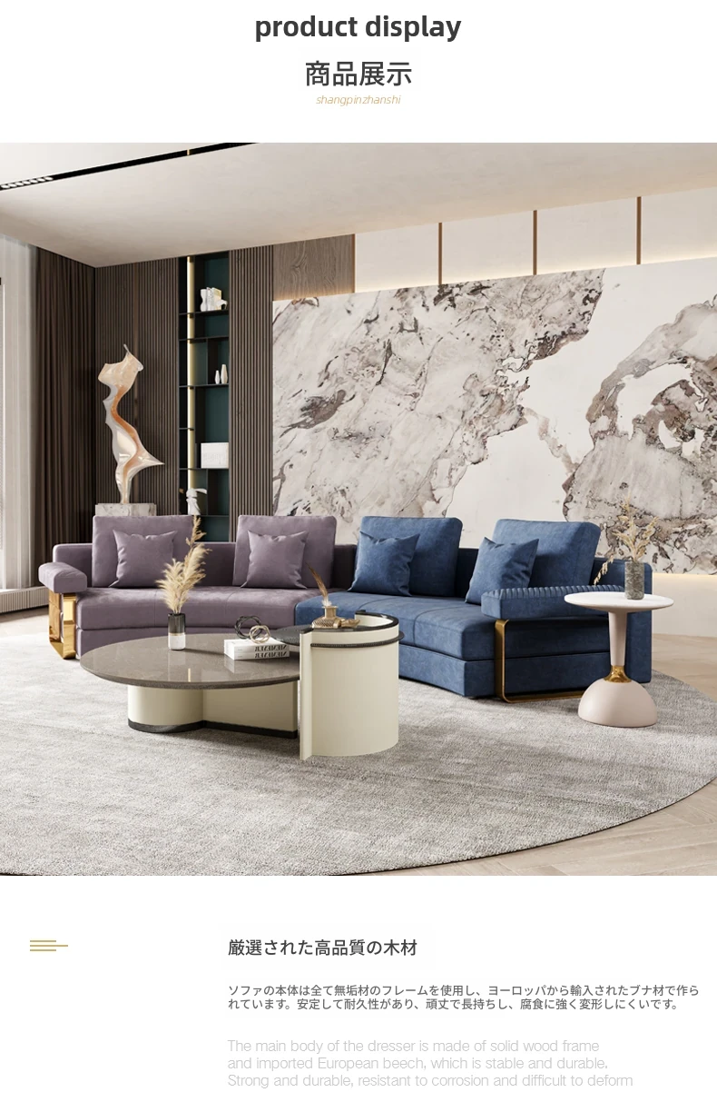 香港スタイルのラグジュアリーサンプルルーム!シングル、ダブル、トリプル対応の高品質レザーとファブリックのソファ。イタリアンデザインのリビングにぴったりのステンレスゴールド仕上げ!快適さとエレガンスを両立した空間を演出します。
