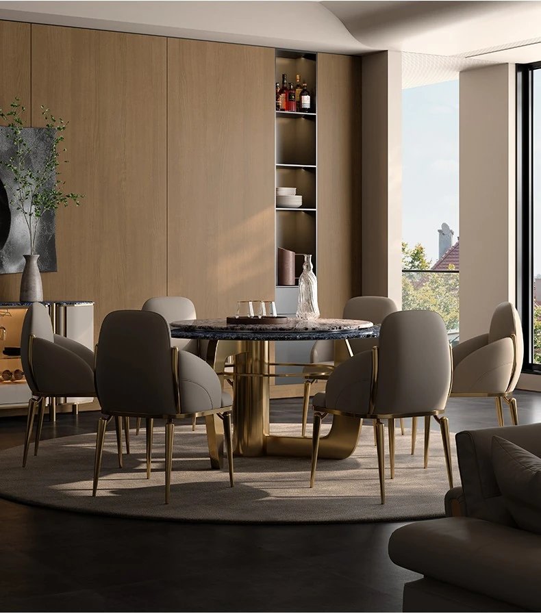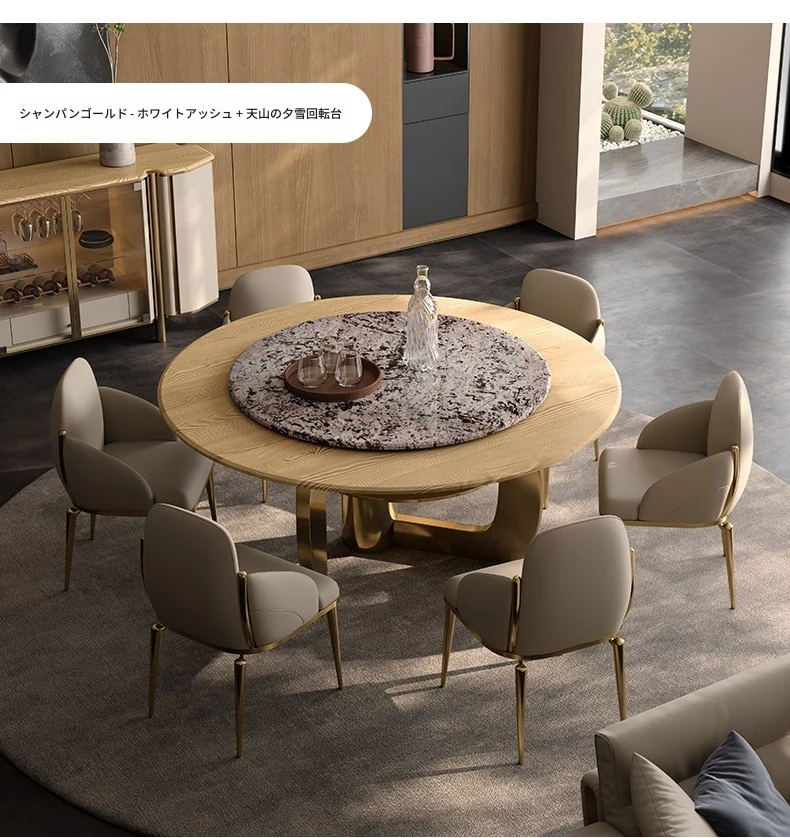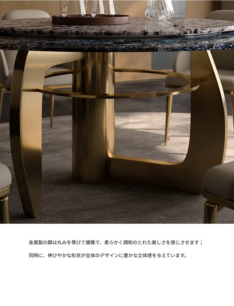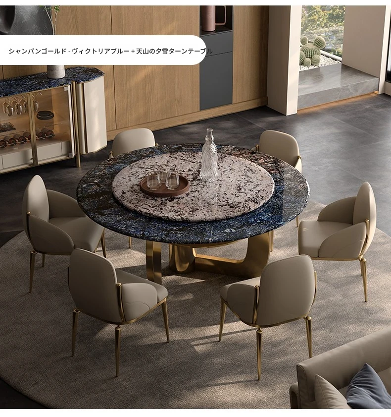 1.8M円形ダイニングテーブル/ビクトリアブルー天板+天山暮雪豪華石回転台+TY27超合成皮革ダイニングチェア*8