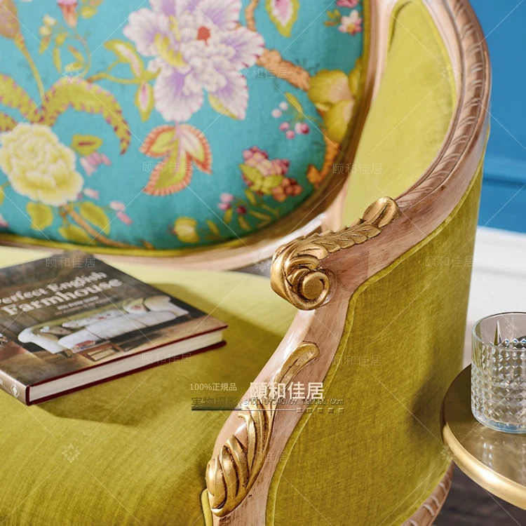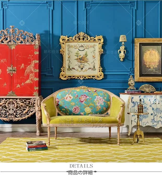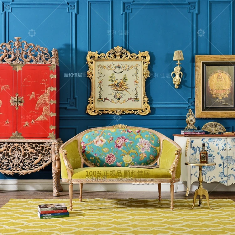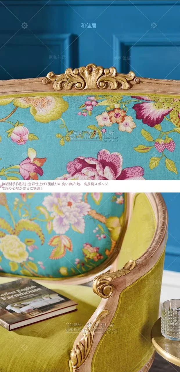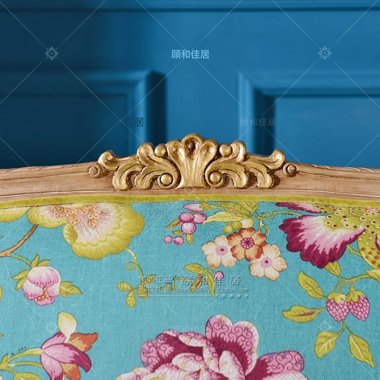 ダイレクトセール!フレンチネオクラシックデザインの高級木製ファブリックプリントダブルソファ。スタジオやモデルルームにぴったりなアメリカンエレガンスの彫刻ソファで、洗練された空間を演出!