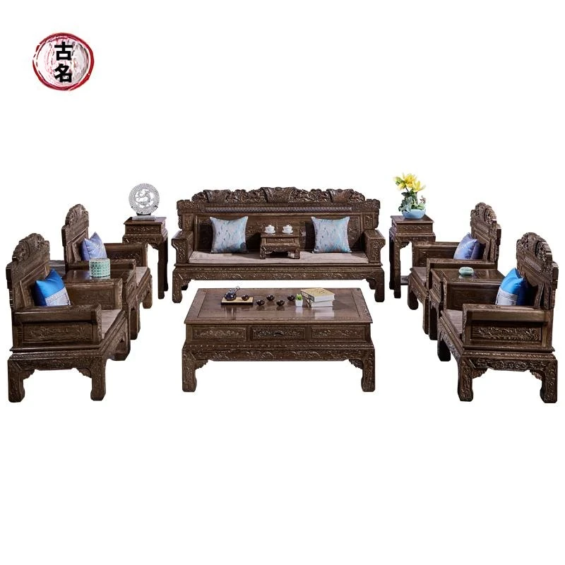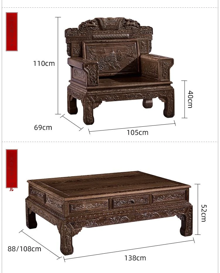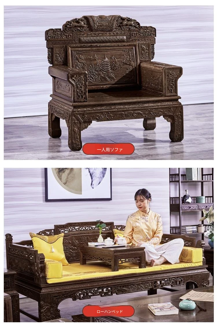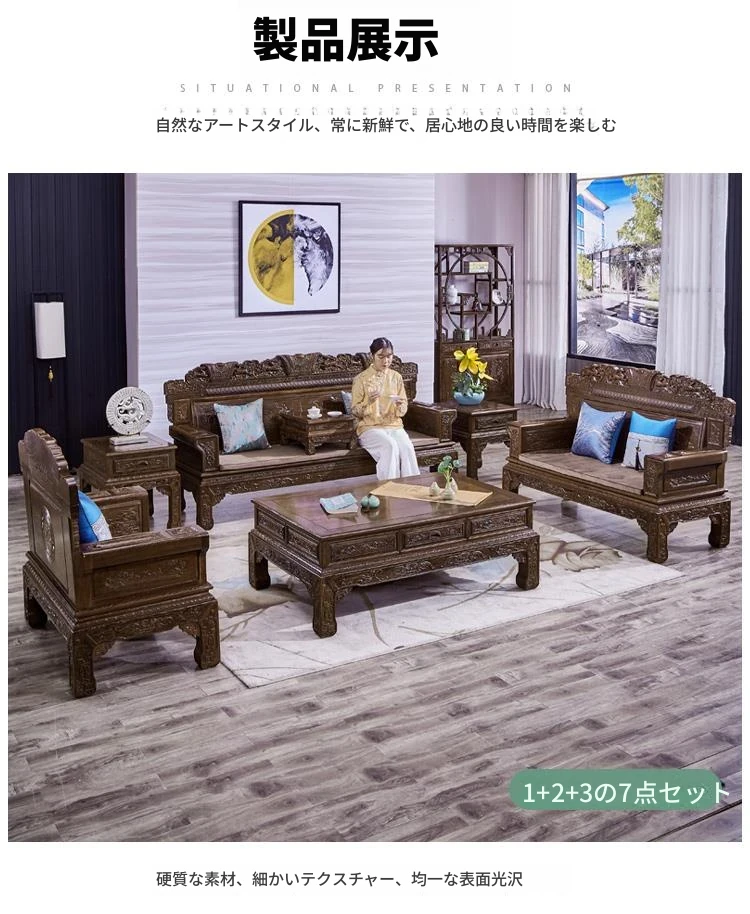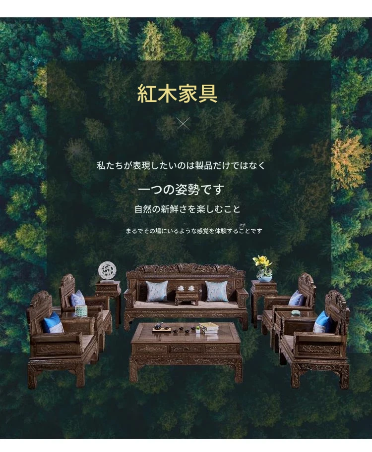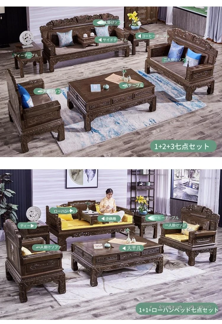 HF2X高級紅木家具セット|鶏翅木使用の中華スタイル11点セット|明清時代の精緻な彫刻|全て無垢材の豪華ソファでおしゃれな別荘空間を演出!