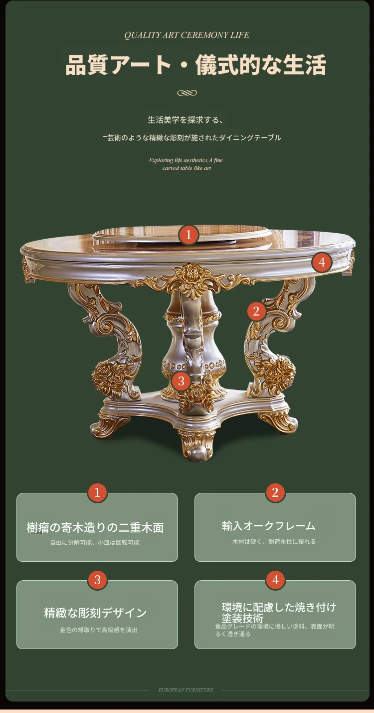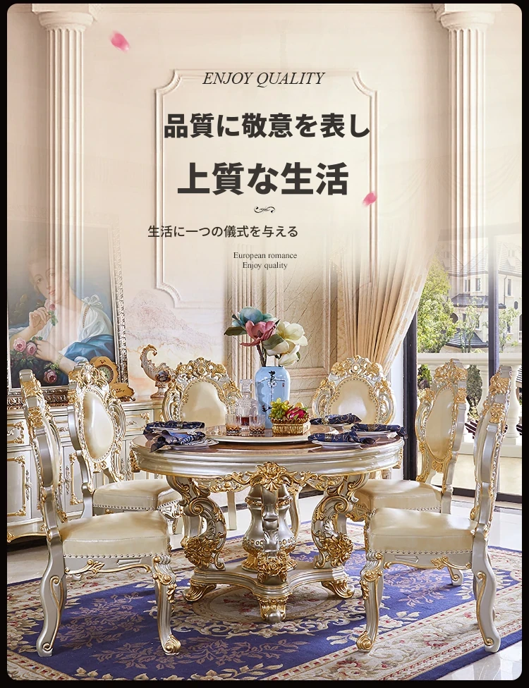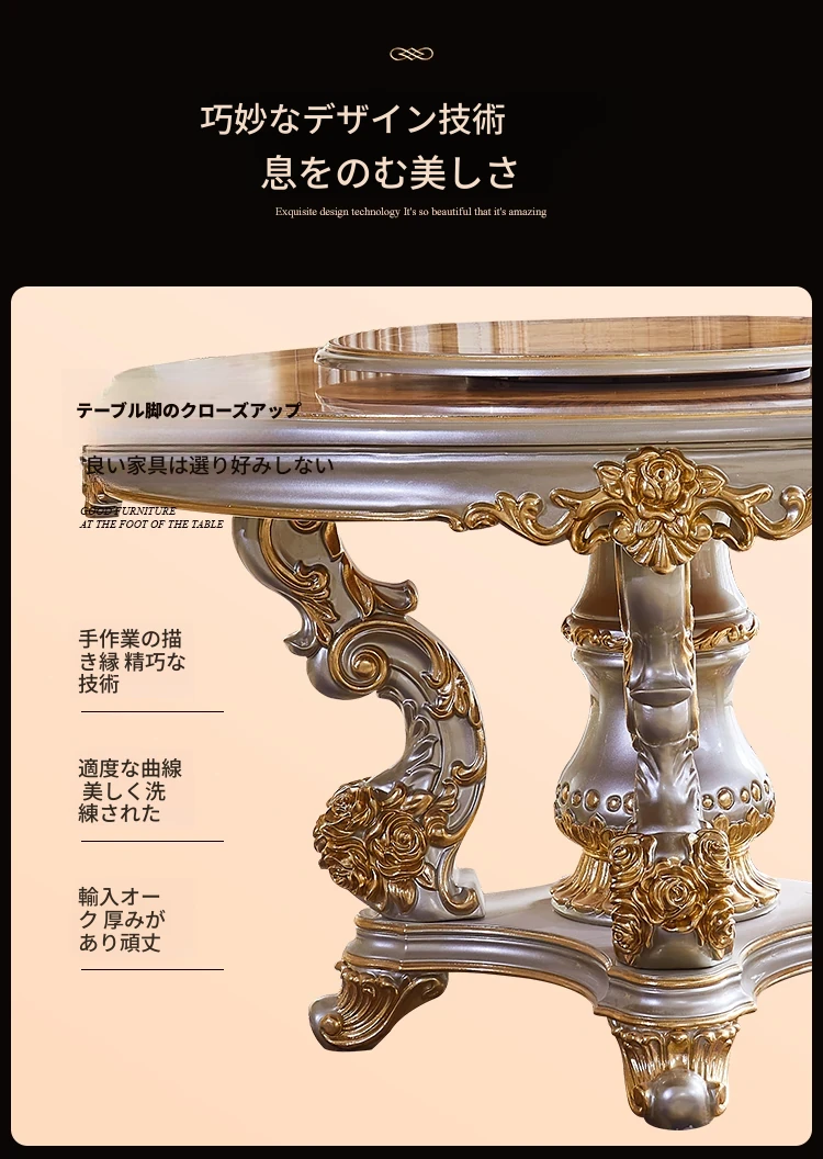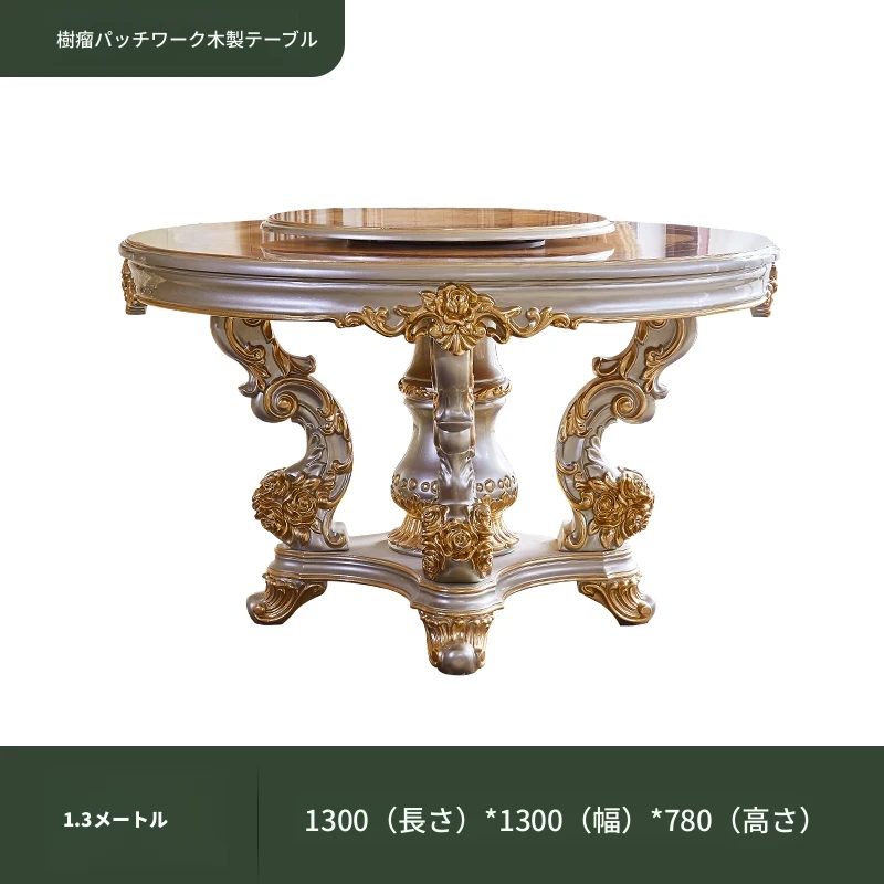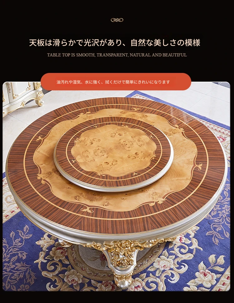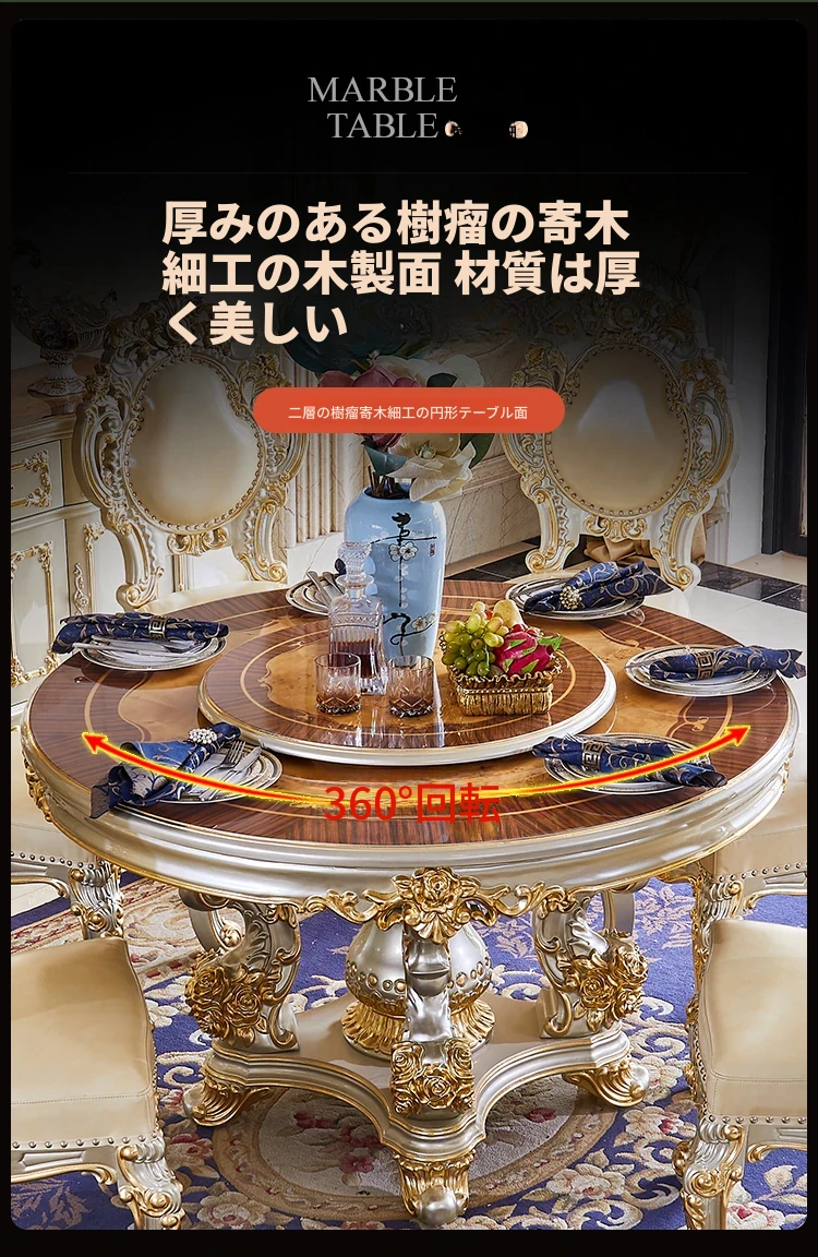 エレガントな欧風デザイン!全実木製の円形ダイニングテーブルセット、回転式トレイ付き。贅沢なシャンパンゴールドカラーで、あなたの食卓に華やかさをプラス。理想の家族の団らん空間を演出します。