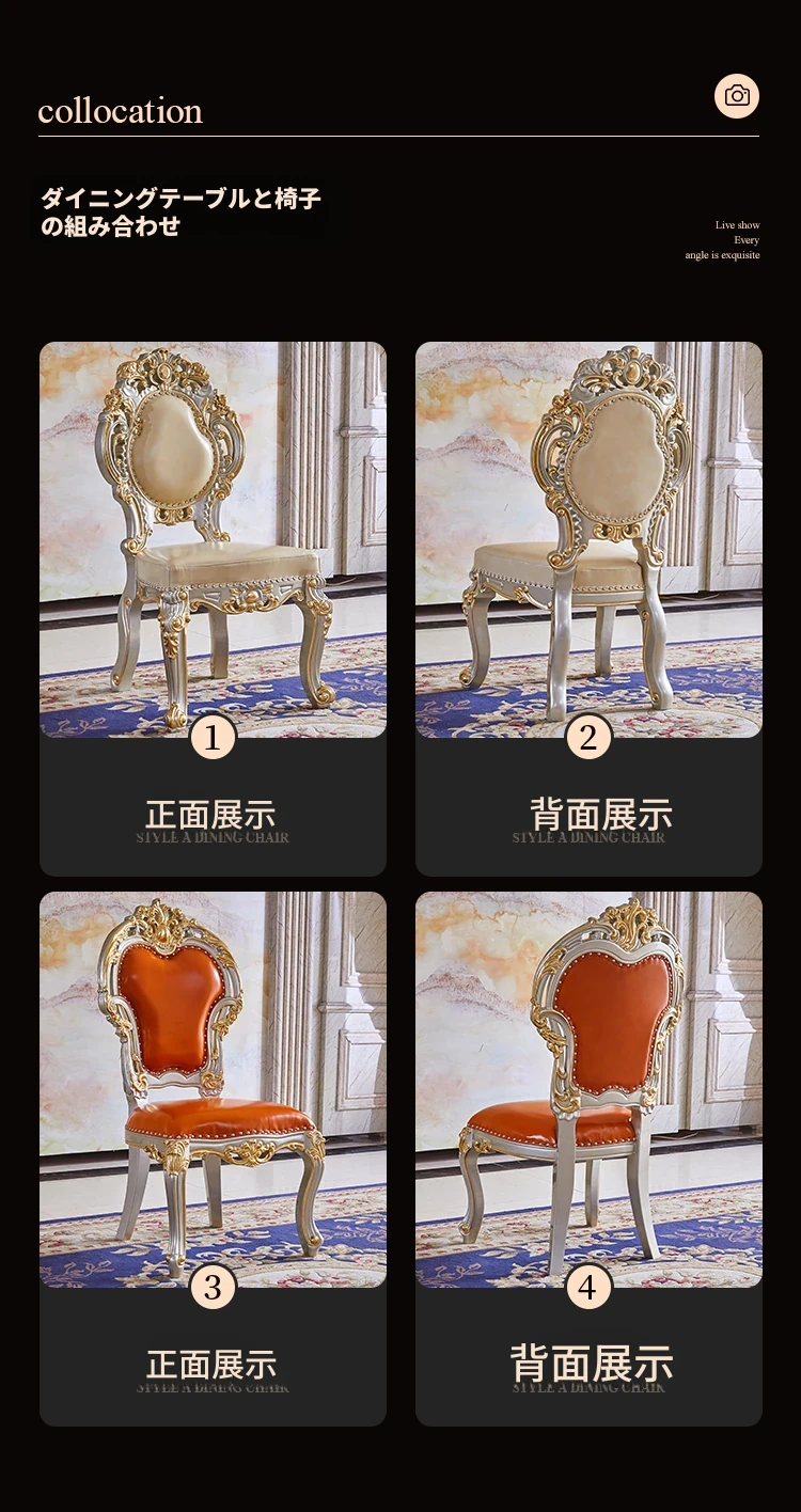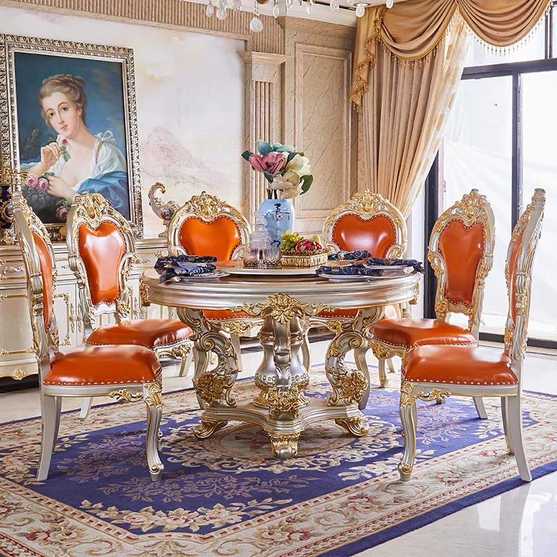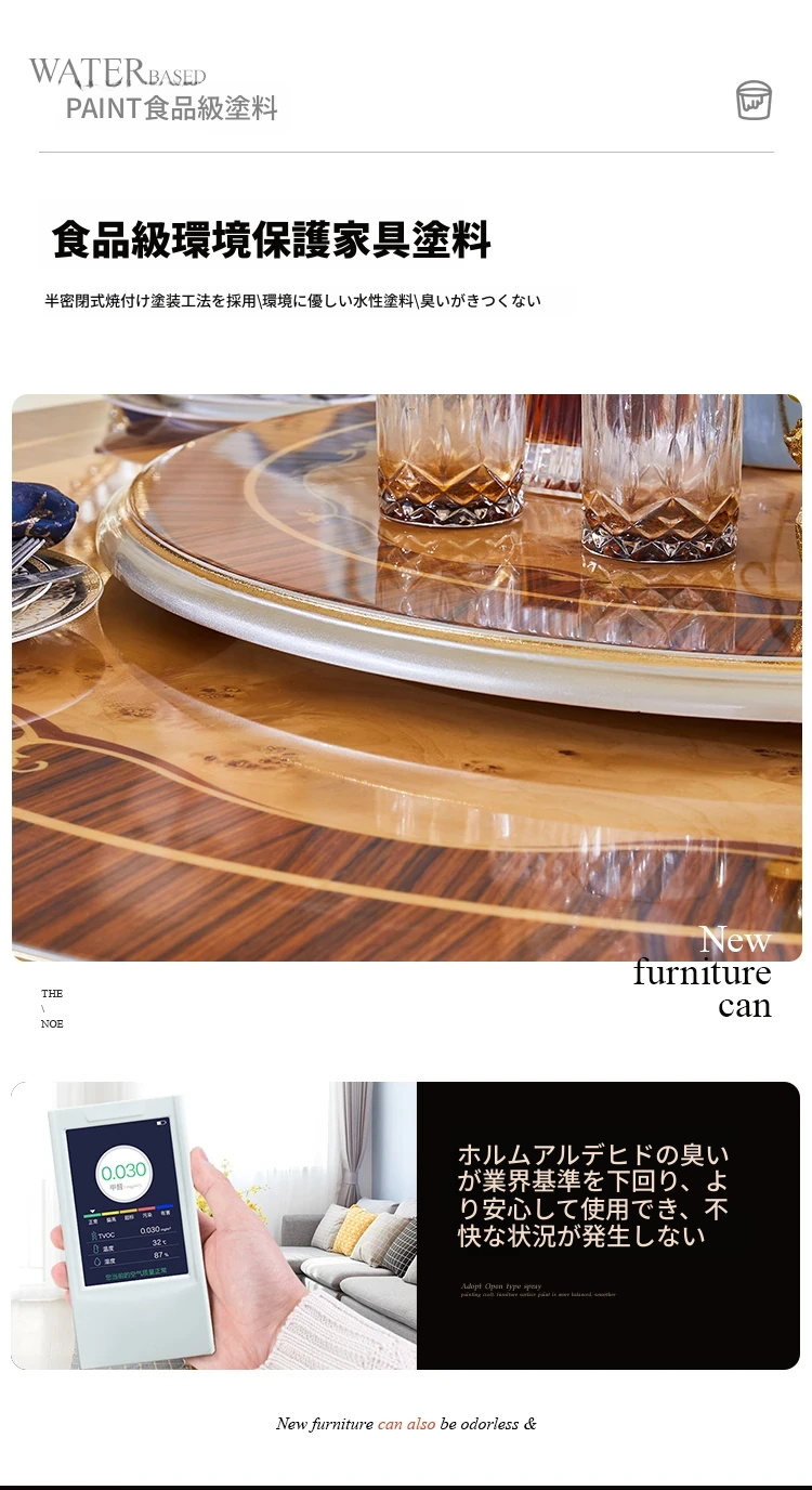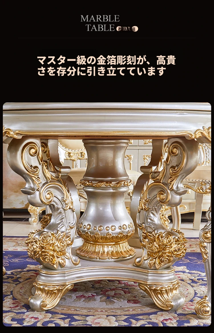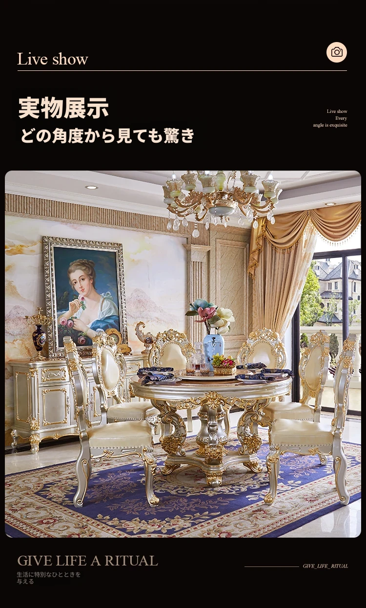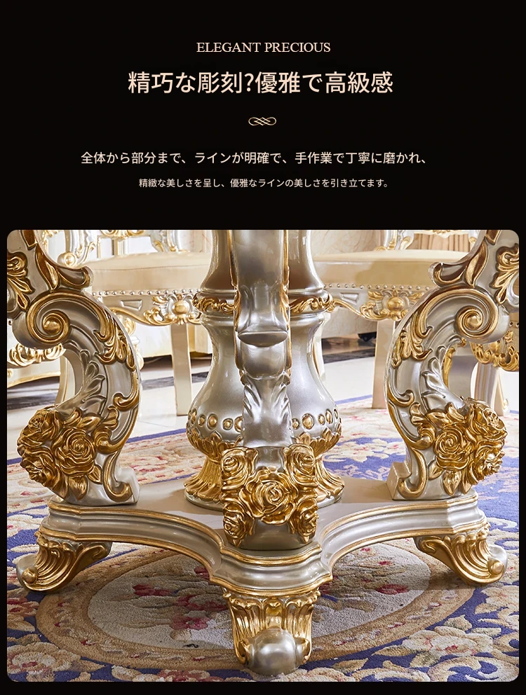 エレガントな欧風デザイン!全実木製の円形ダイニングテーブルセット、回転式トレイ付き。贅沢なシャンパンゴールドカラーで、あなたの食卓に華やかさをプラス。理想の家族の団らん空間を演出します。