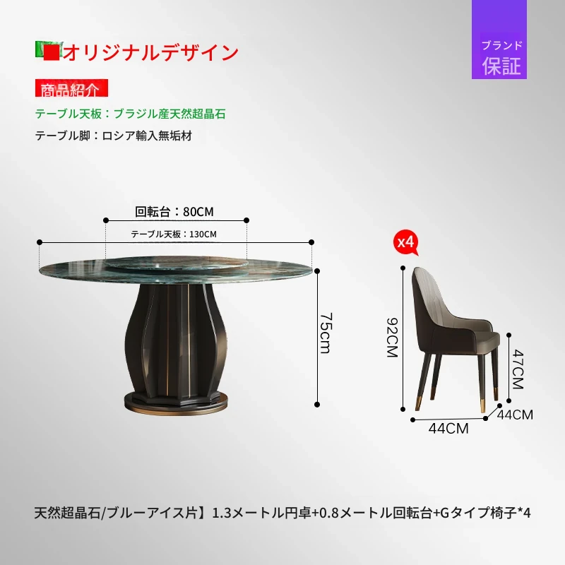 【天然超晶石】1.3メートル円卓+0.8メートル回転台+4脚椅子