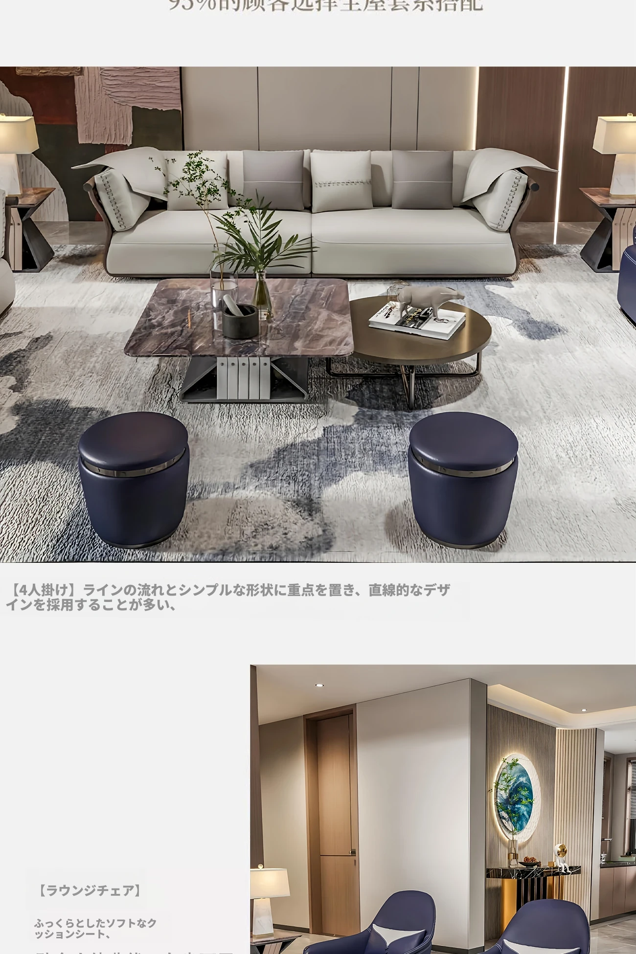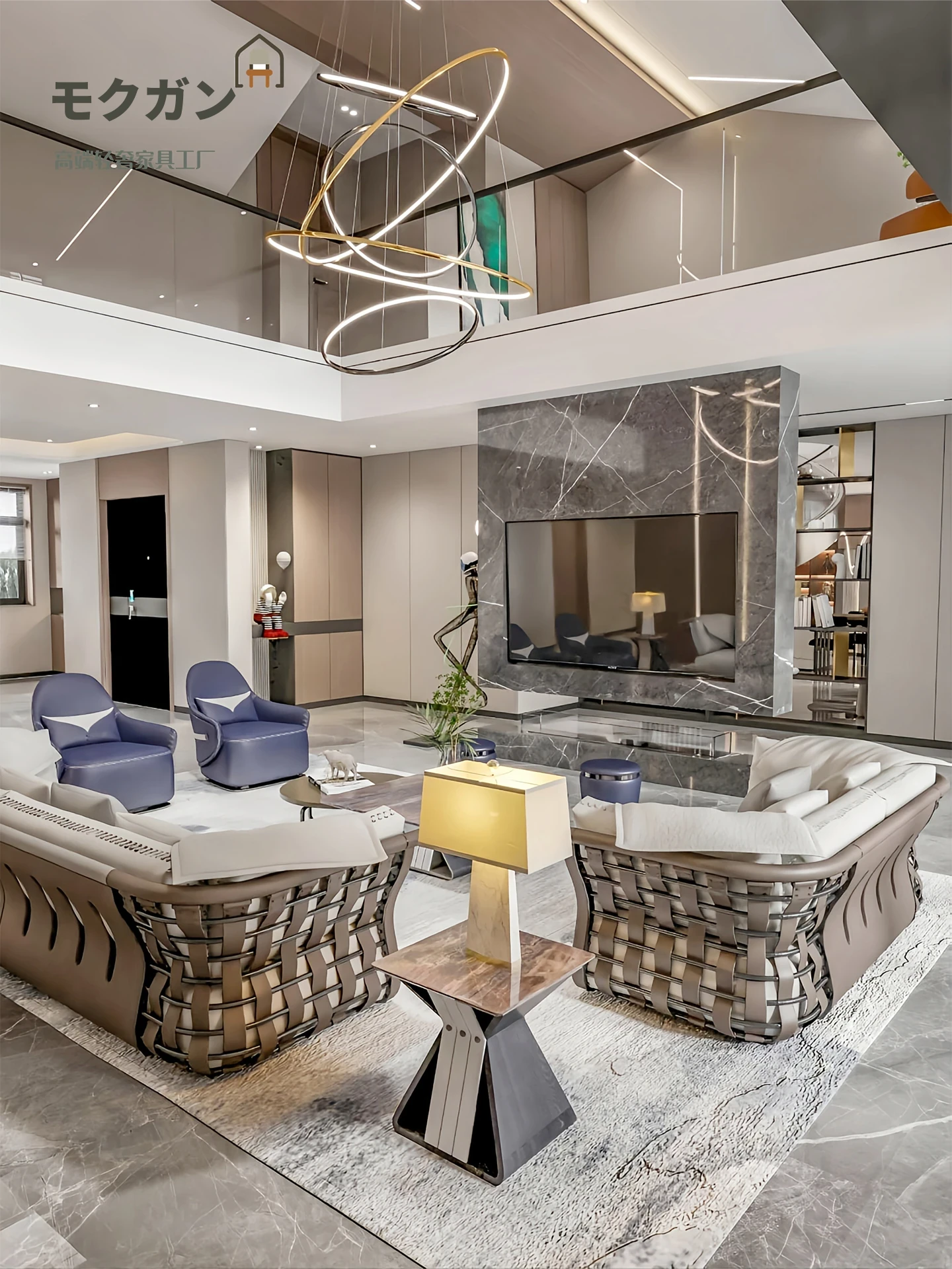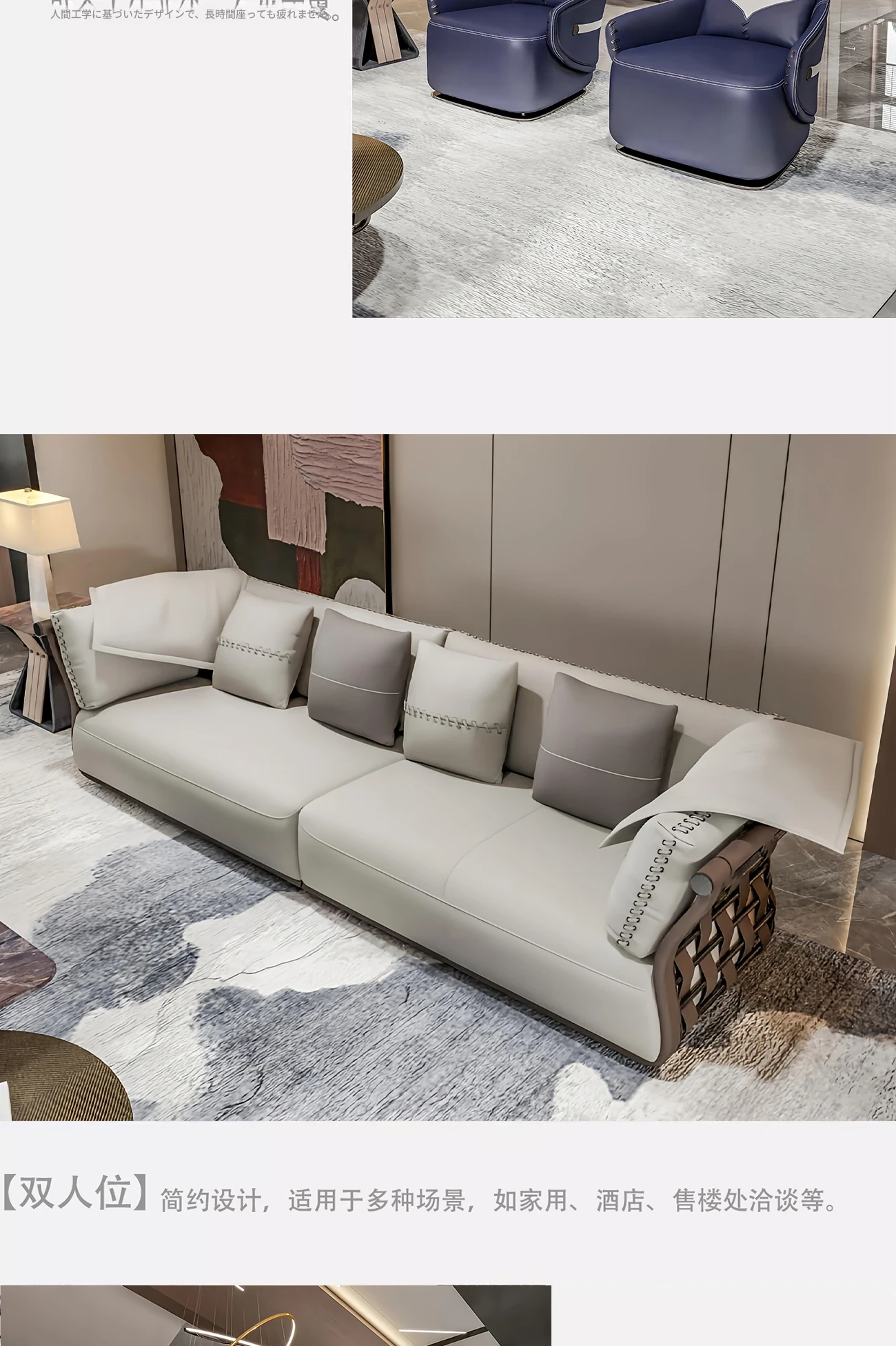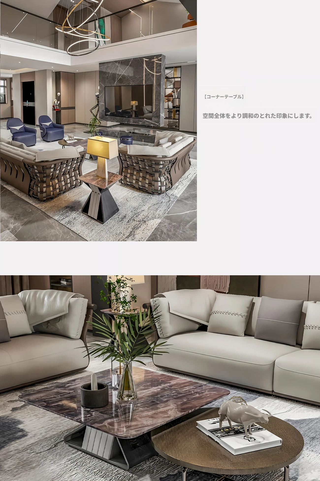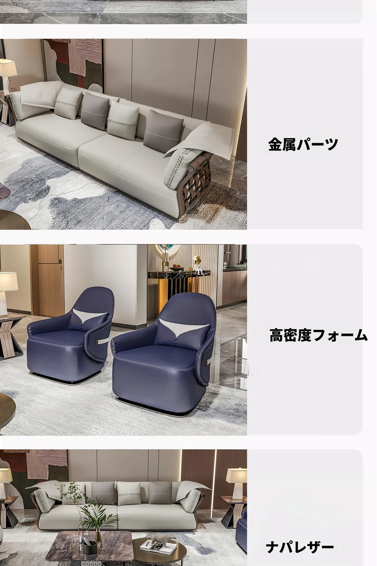 香港スタイルのラグジュアリーサンプルルーム!シングル、ダブル、トリプル対応の高品質レザーとファブリックのソファ。イタリアンデザインのリビングにぴったりのステンレスゴールド仕上げ!快適さとエレガンスを両立した空間を演出します。