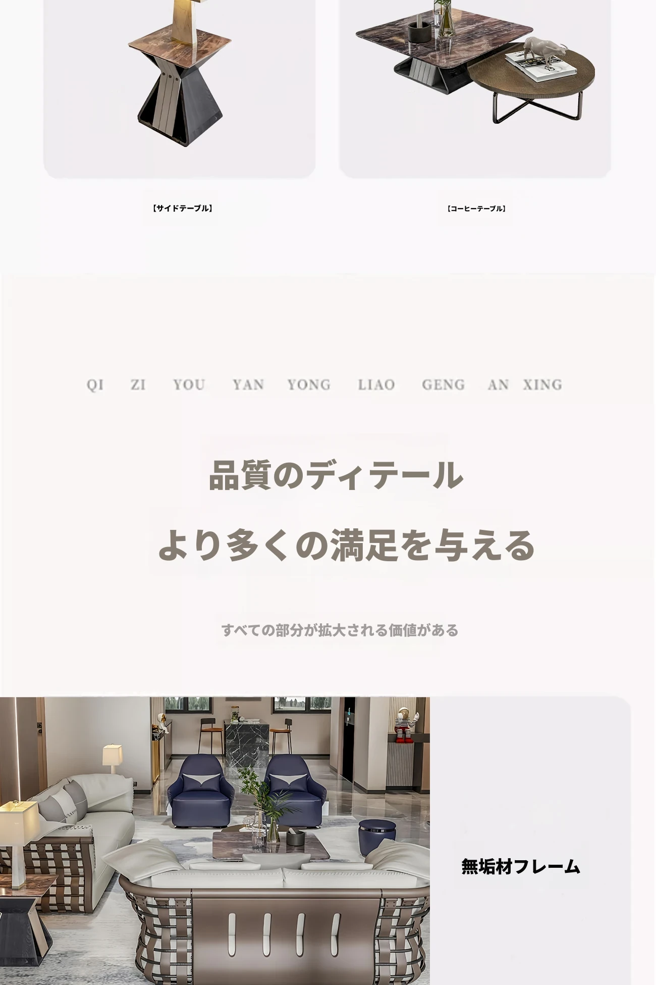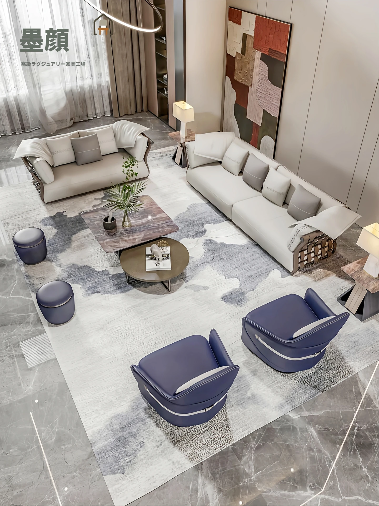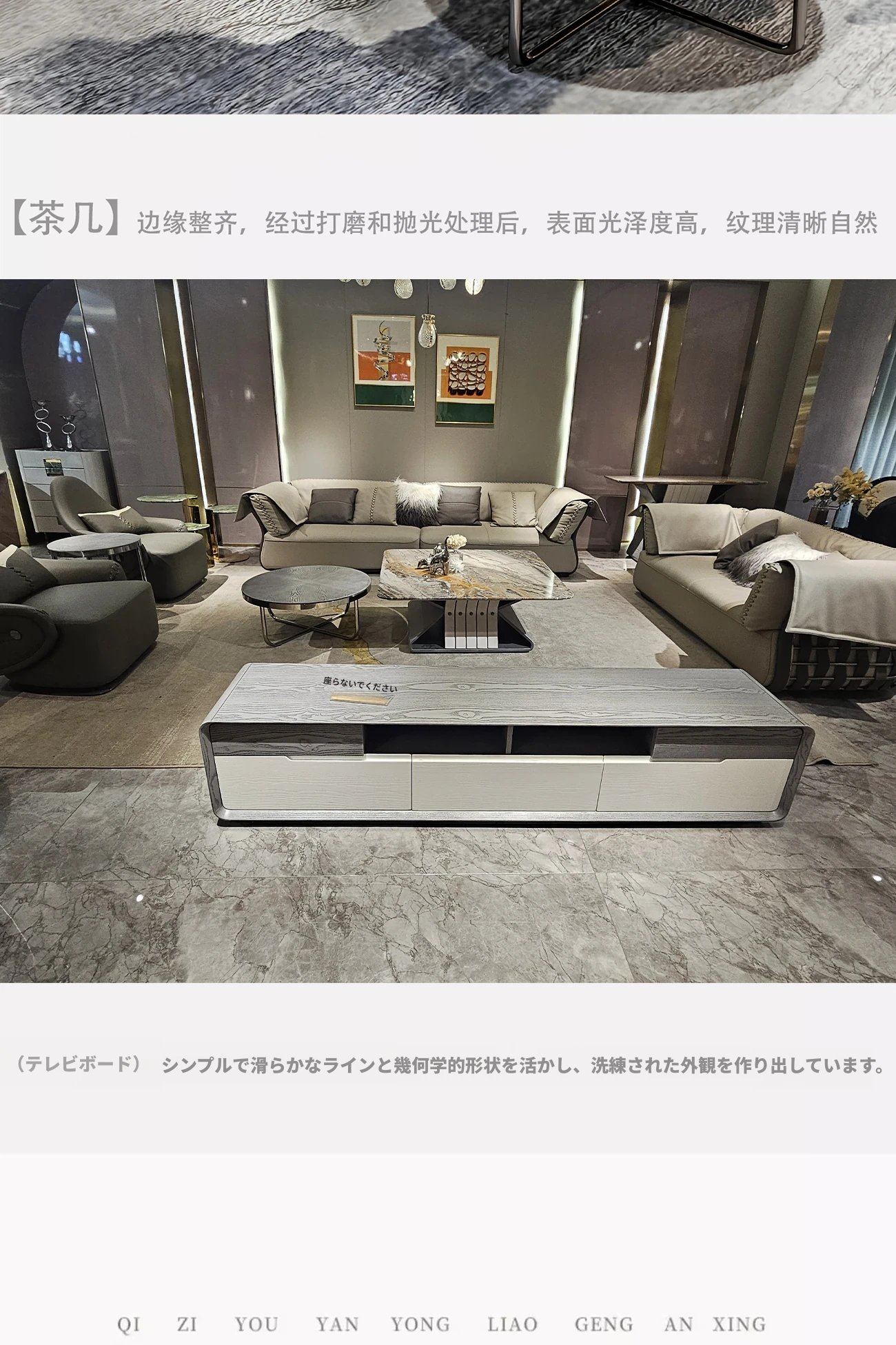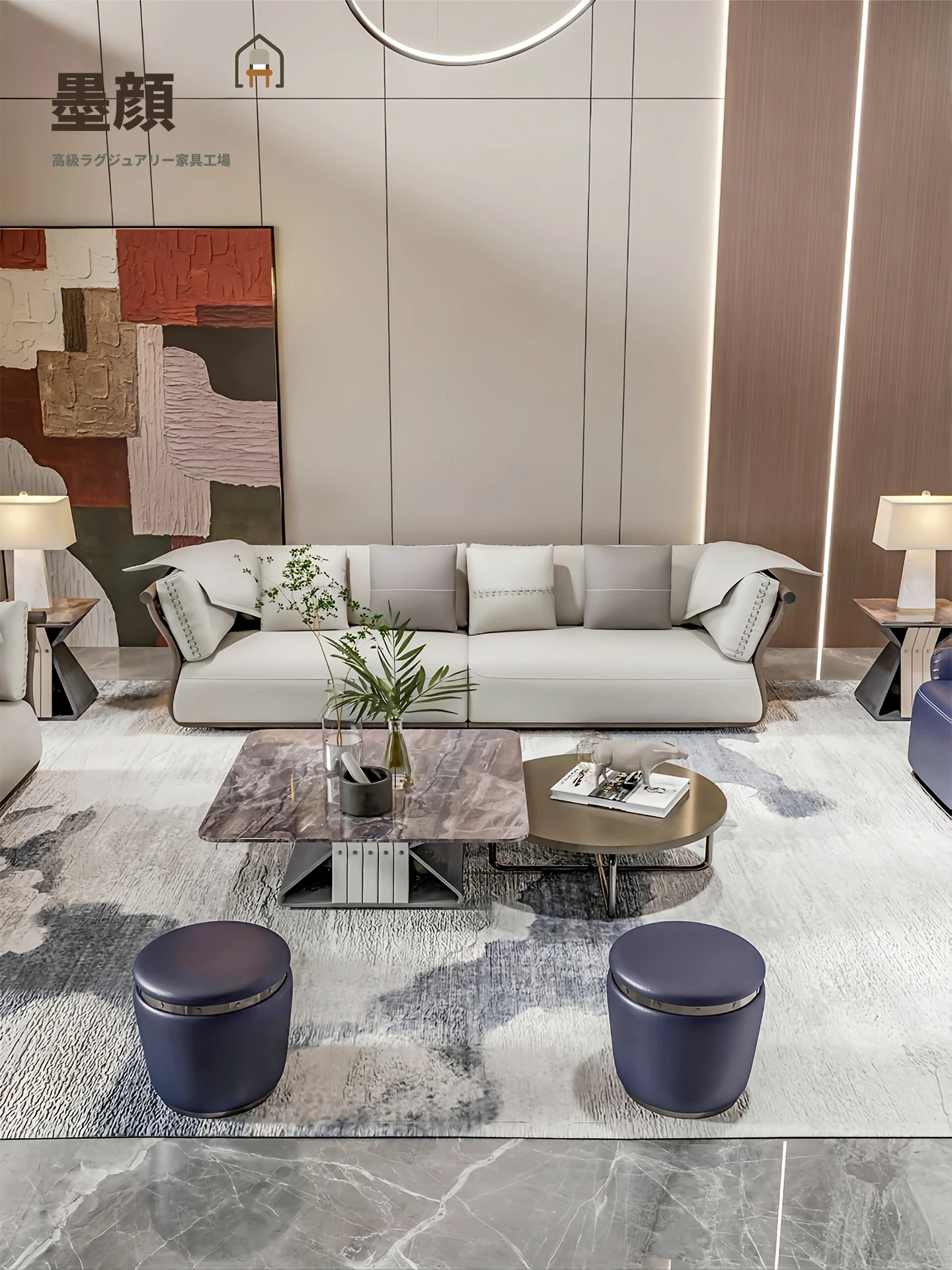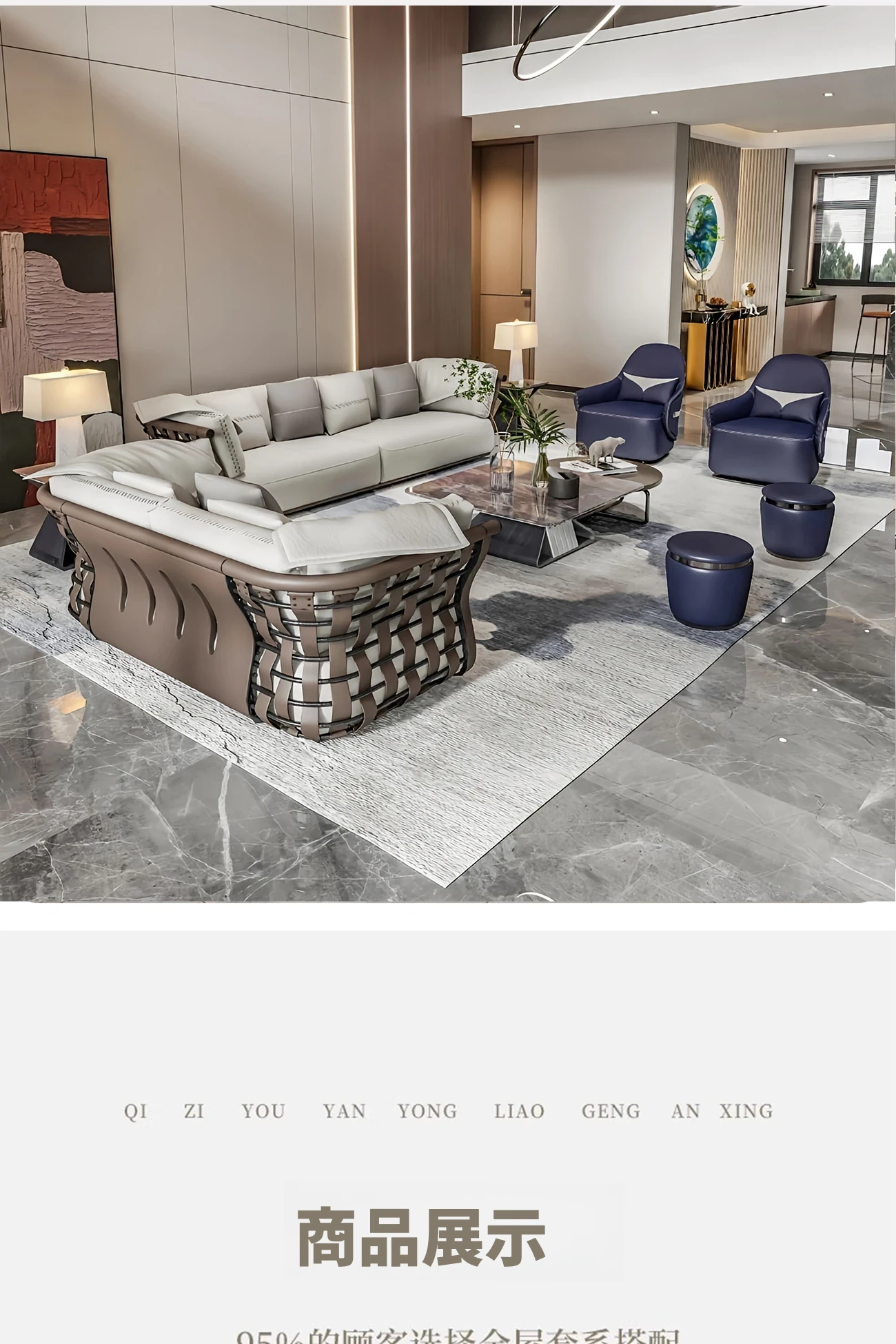 香港スタイルのラグジュアリーサンプルルーム!シングル、ダブル、トリプル対応の高品質レザーとファブリックのソファ。イタリアンデザインのリビングにぴったりのステンレスゴールド仕上げ!快適さとエレガンスを両立した空間を演出します。