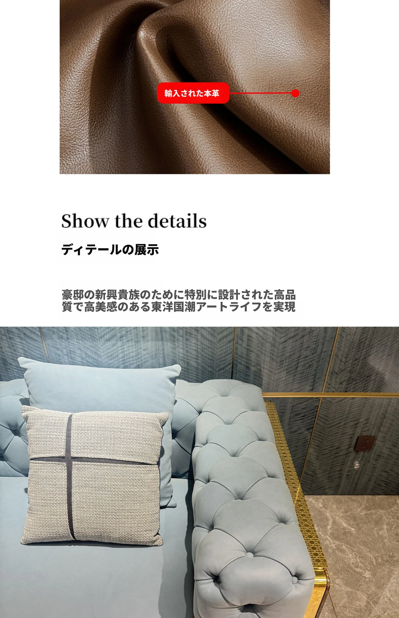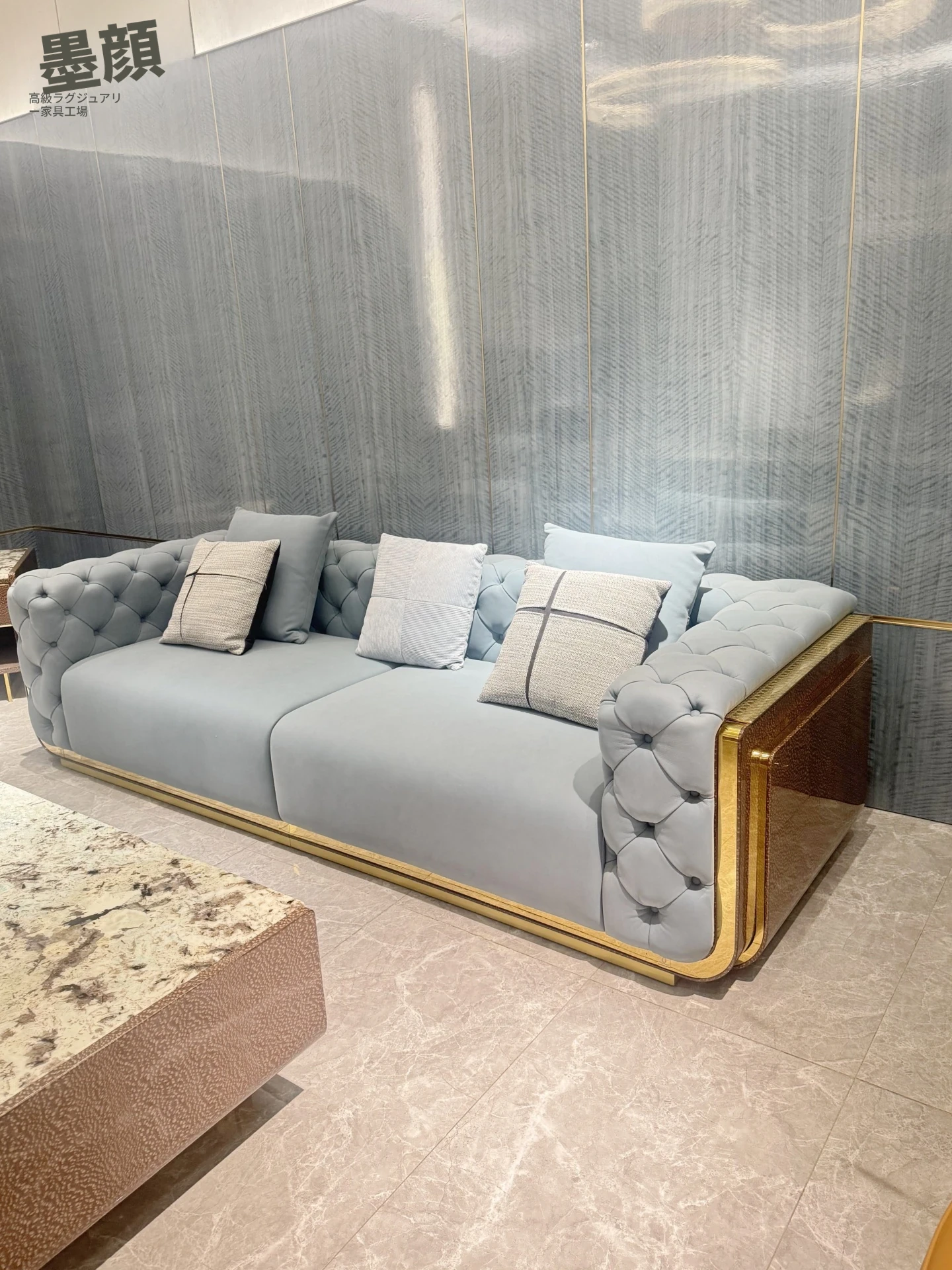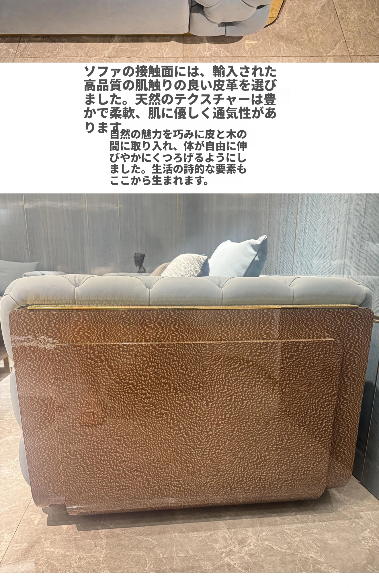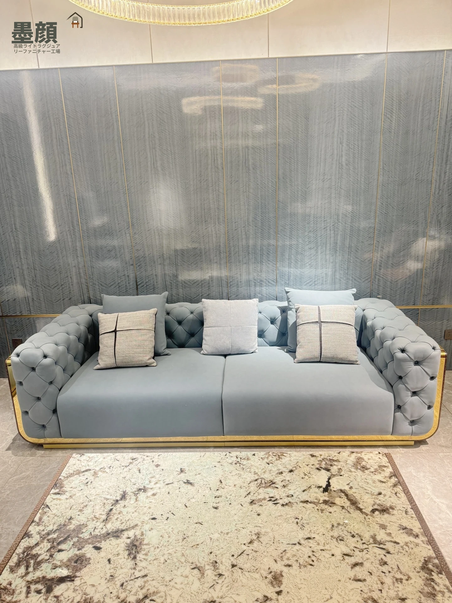 香港スタイルのラグジュアリーサンプルルーム!シングル、ダブル、トリプル対応の高品質レザーとファブリックのソファ。イタリアンデザインのリビングにぴったりのステンレスゴールド仕上げ!快適さとエレガンスを両立した空間を演出します。