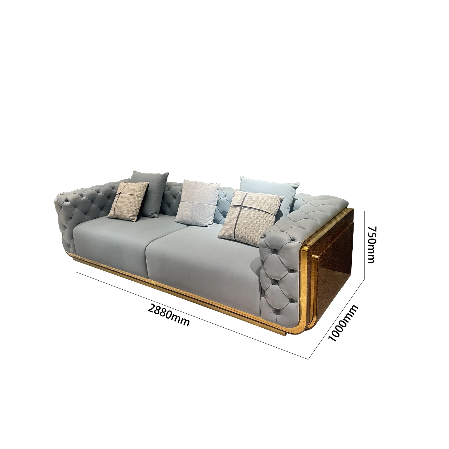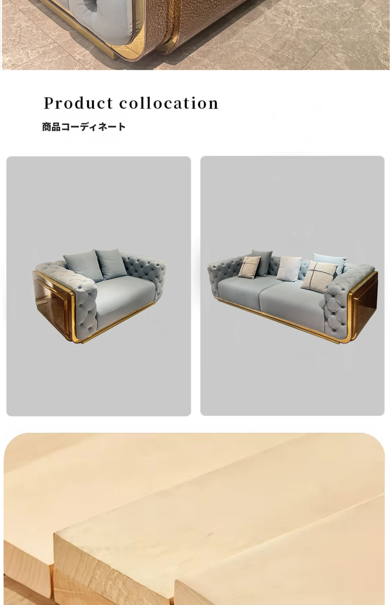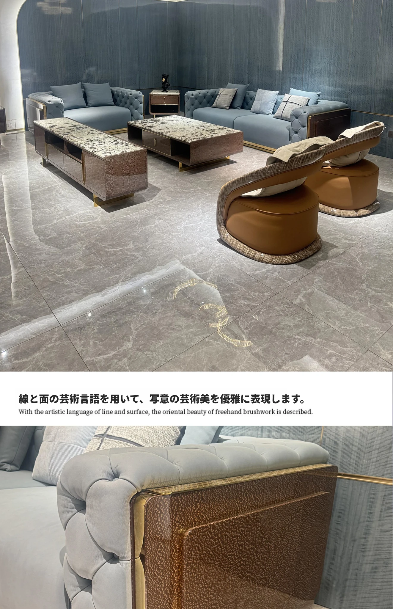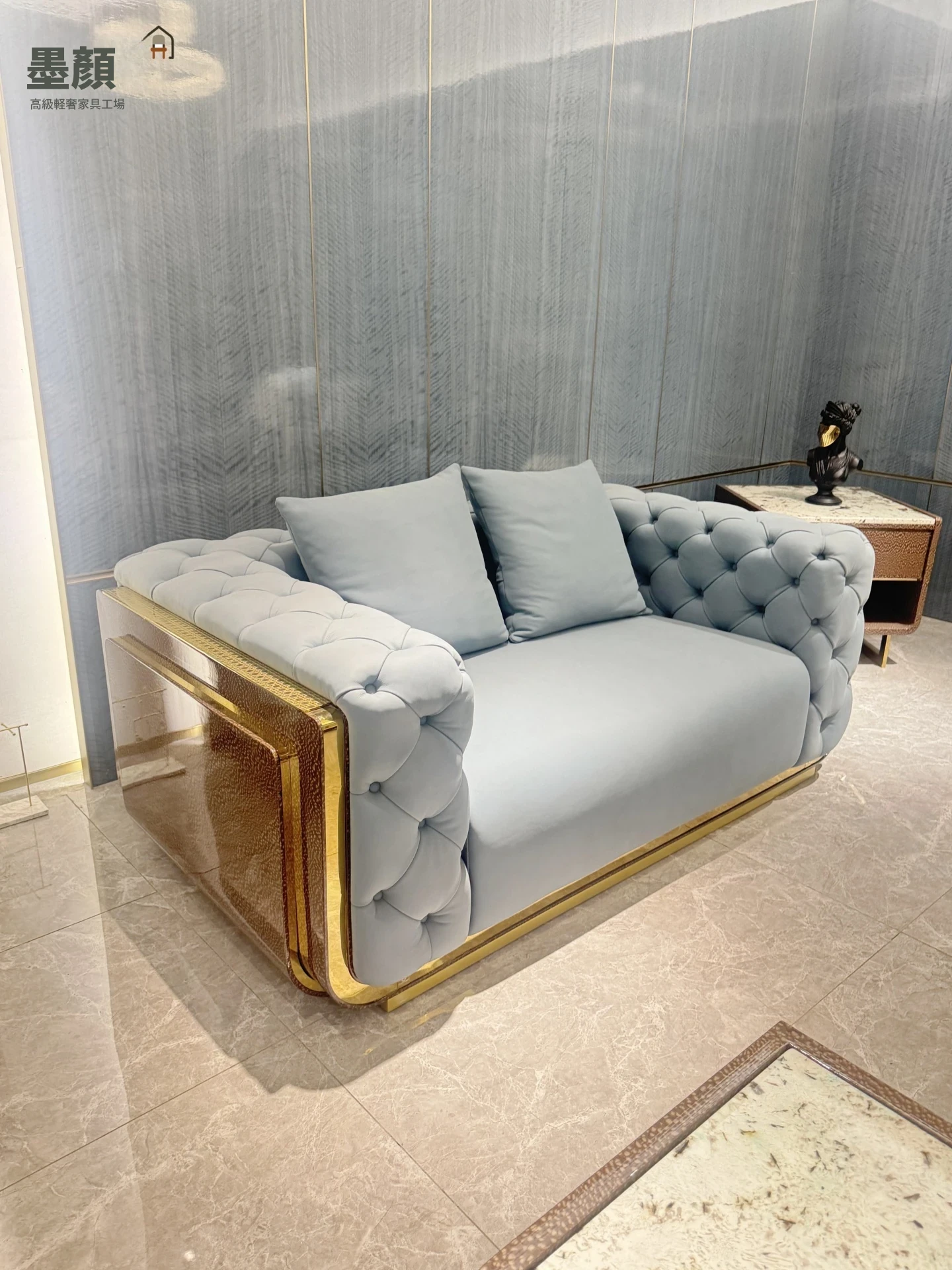 香港スタイルのラグジュアリーサンプルルーム!シングル、ダブル、トリプル対応の高品質レザーとファブリックのソファ。イタリアンデザインのリビングにぴったりのステンレスゴールド仕上げ!快適さとエレガンスを両立した空間を演出します。