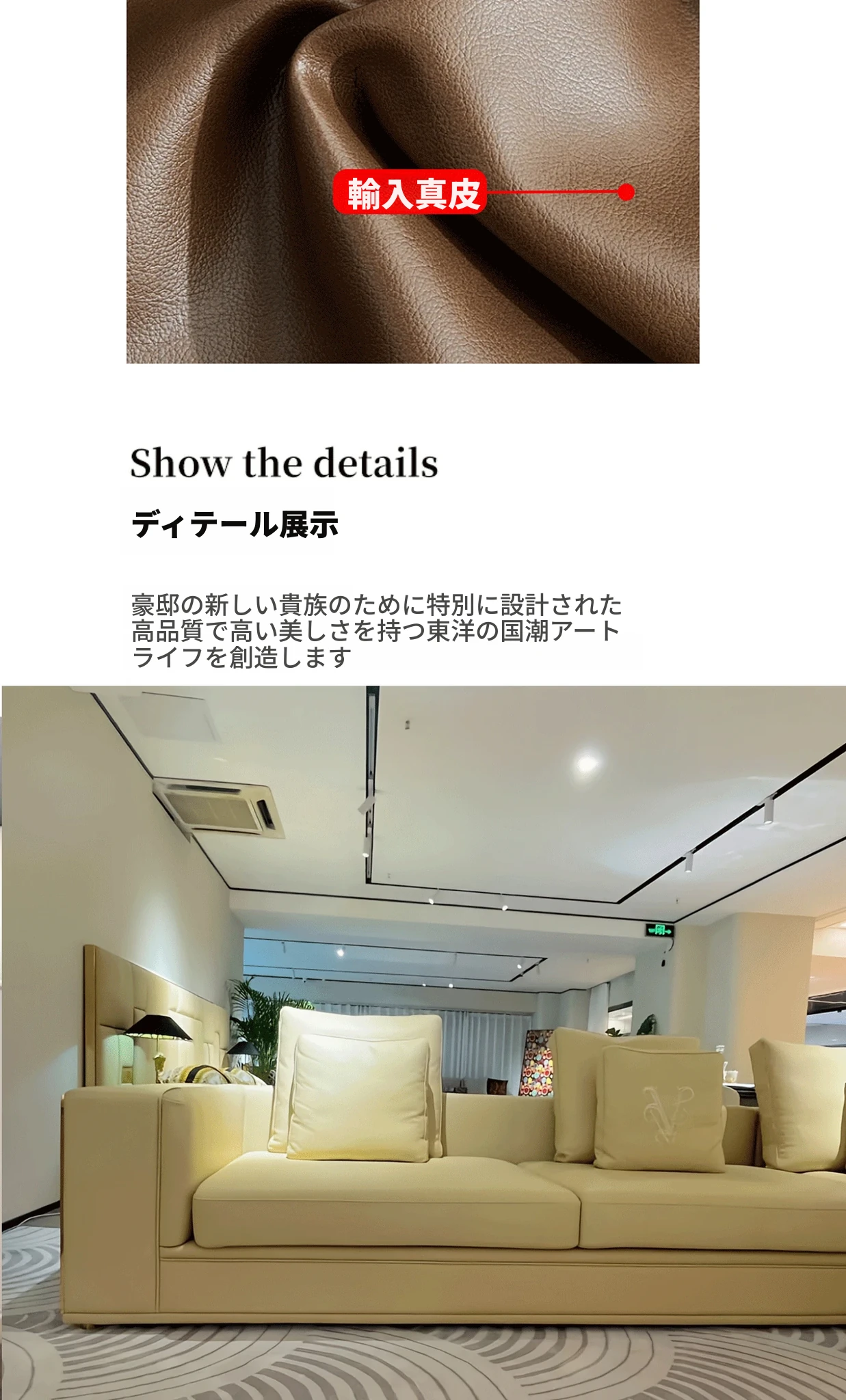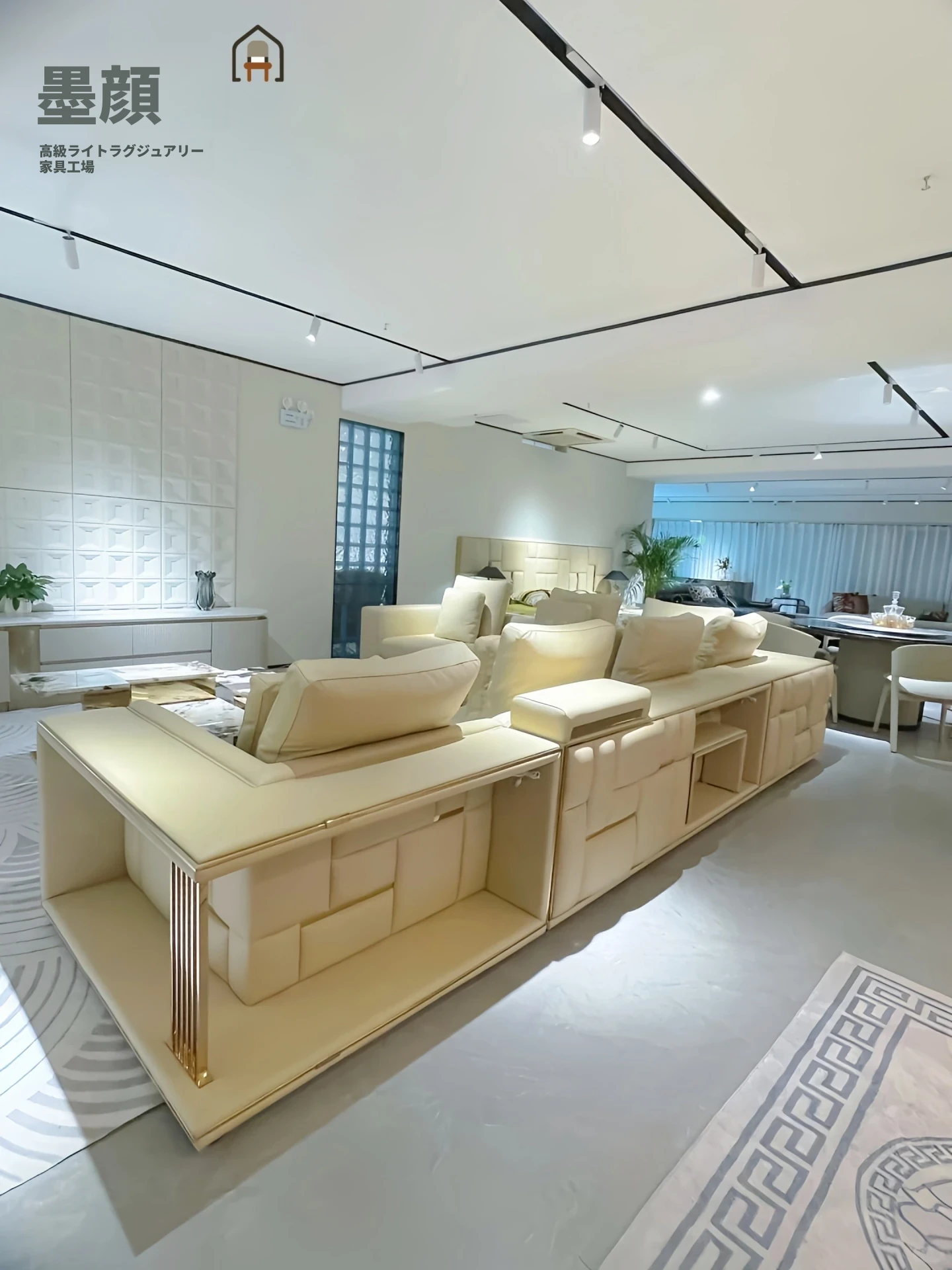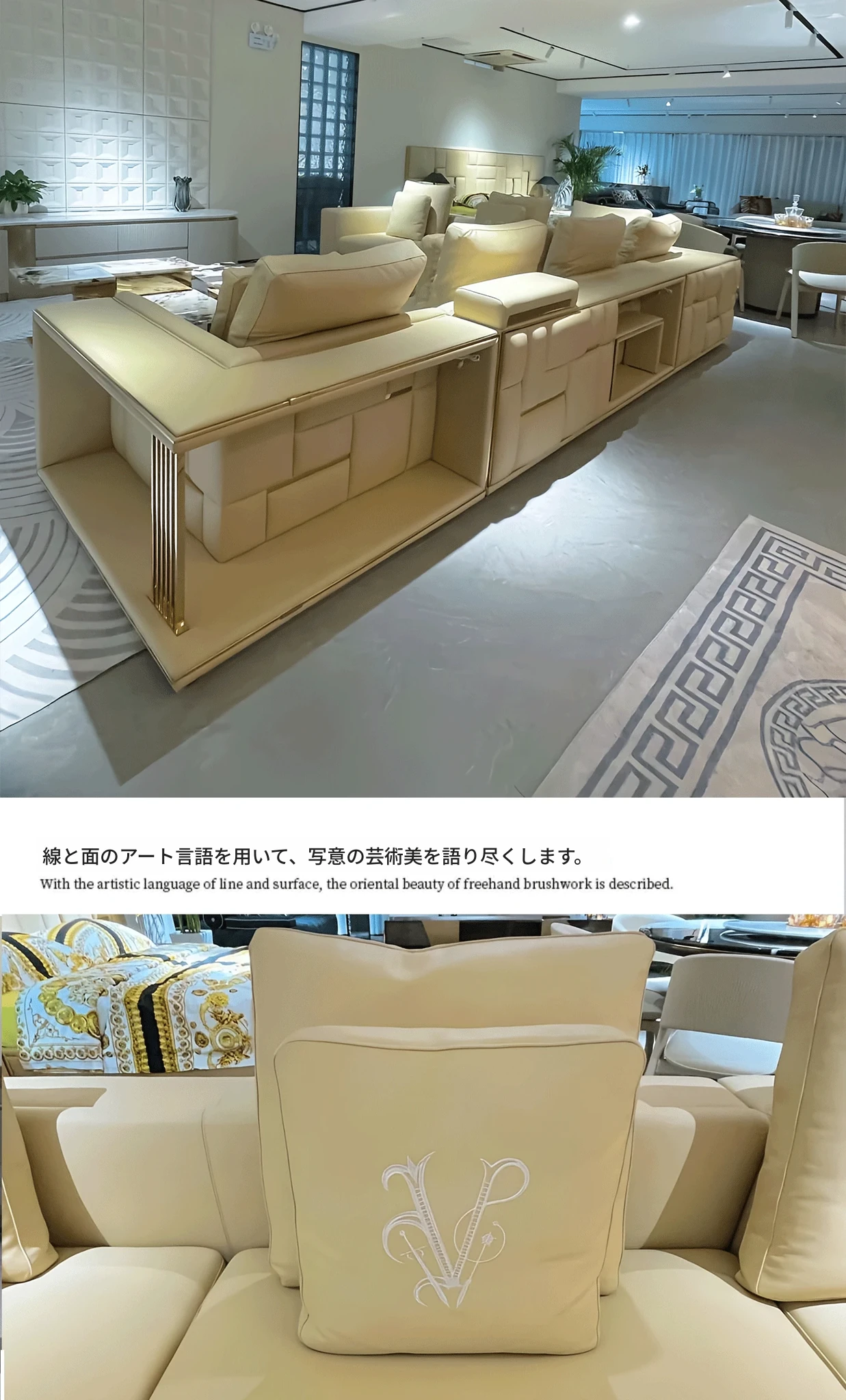 香港スタイルのラグジュアリーサンプルルーム!シングル、ダブル、トリプル対応の高品質レザーとファブリックのソファ。イタリアンデザインのリビングにぴったりのステンレスゴールド仕上げ!快適さとエレガンスを両立した空間を演出します。