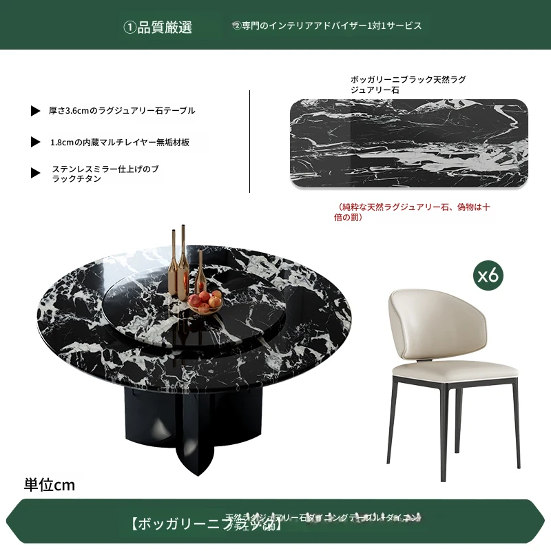 [ブルガリブラック] 天然ラグジュアリーストーン ダイニングテーブル+回転台+ダイニングチェア*6