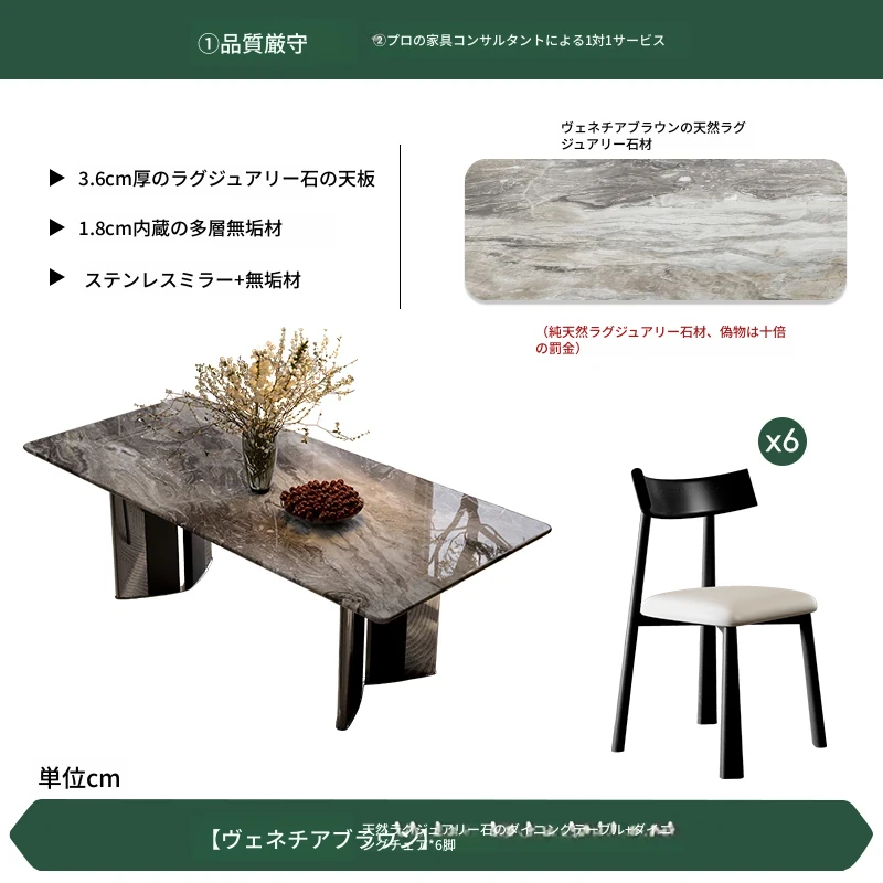 [国産ヴェネツィアブラウン]天然高級石材ダイニングテーブル+チェア*6(純天然高級石材、偽物は10倍の罰金)