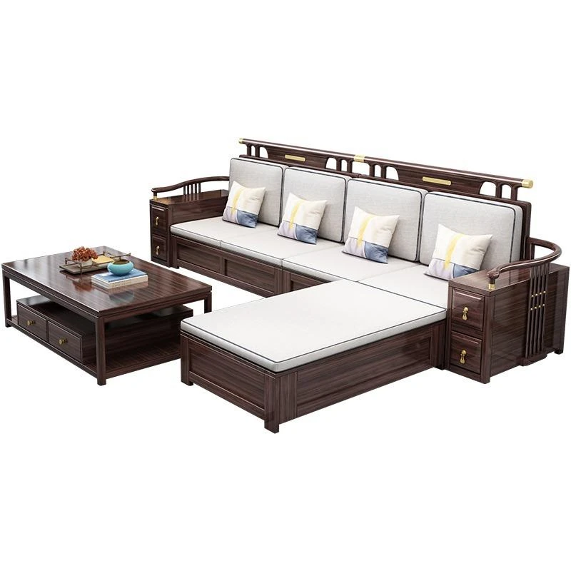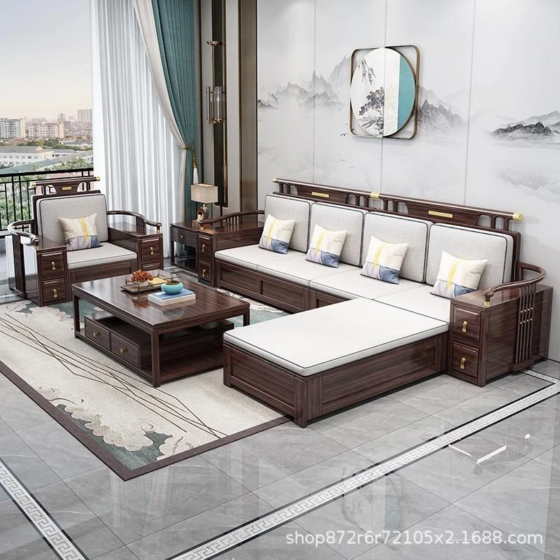 新中式ウッドソファセット - ウッキン材使用、モダンで軽やかな贅沢感。小型から大型の住まいに最適な布製、禅の美を感じるリビングや別荘にぴったりの家具です。